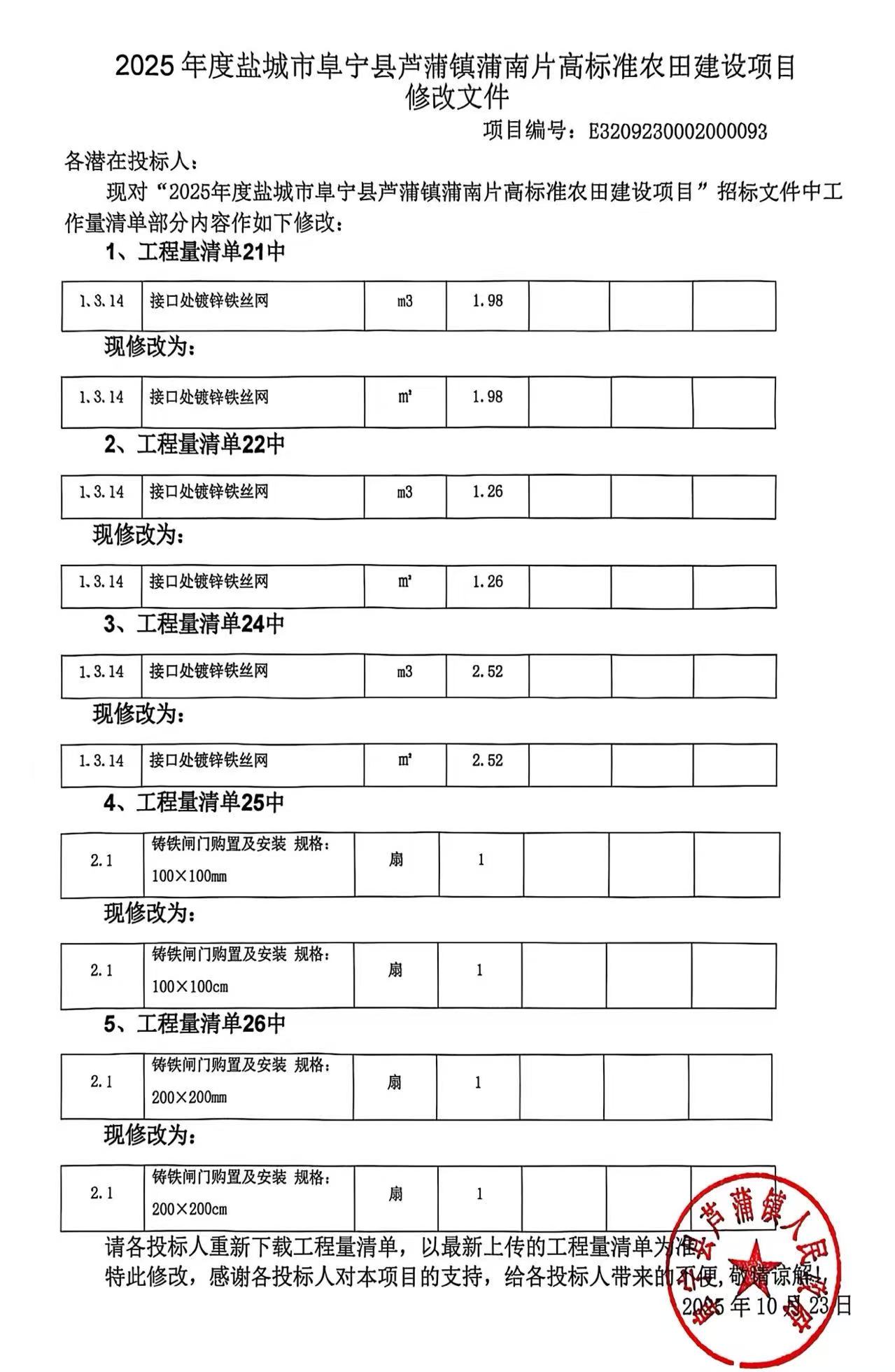 2025年度盐城市阜宁县芦蒲镇蒲南片高标准农田建设项目修改文件