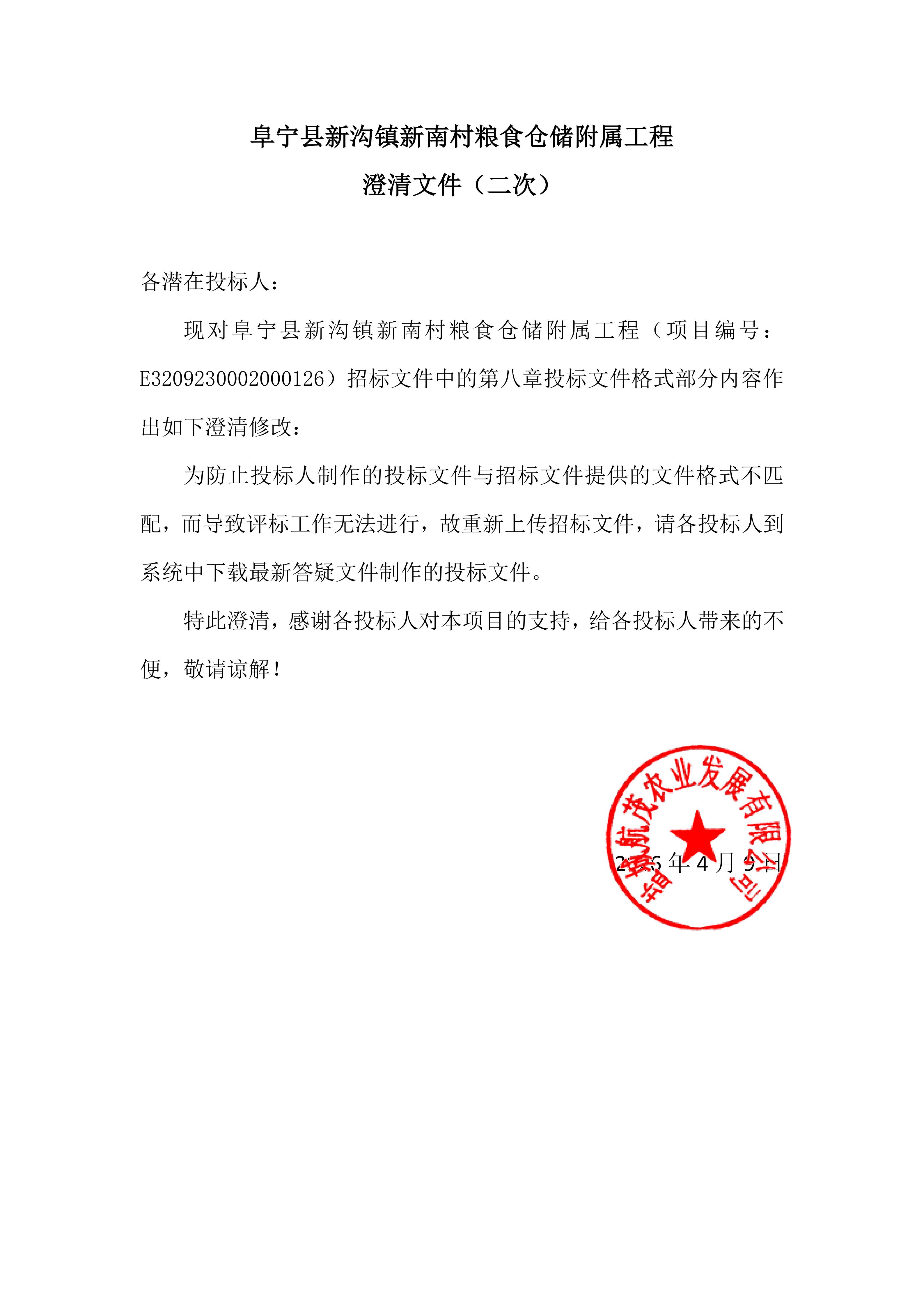 阜宁县新沟镇新南村粮食仓储附属工程澄清文件(二次)