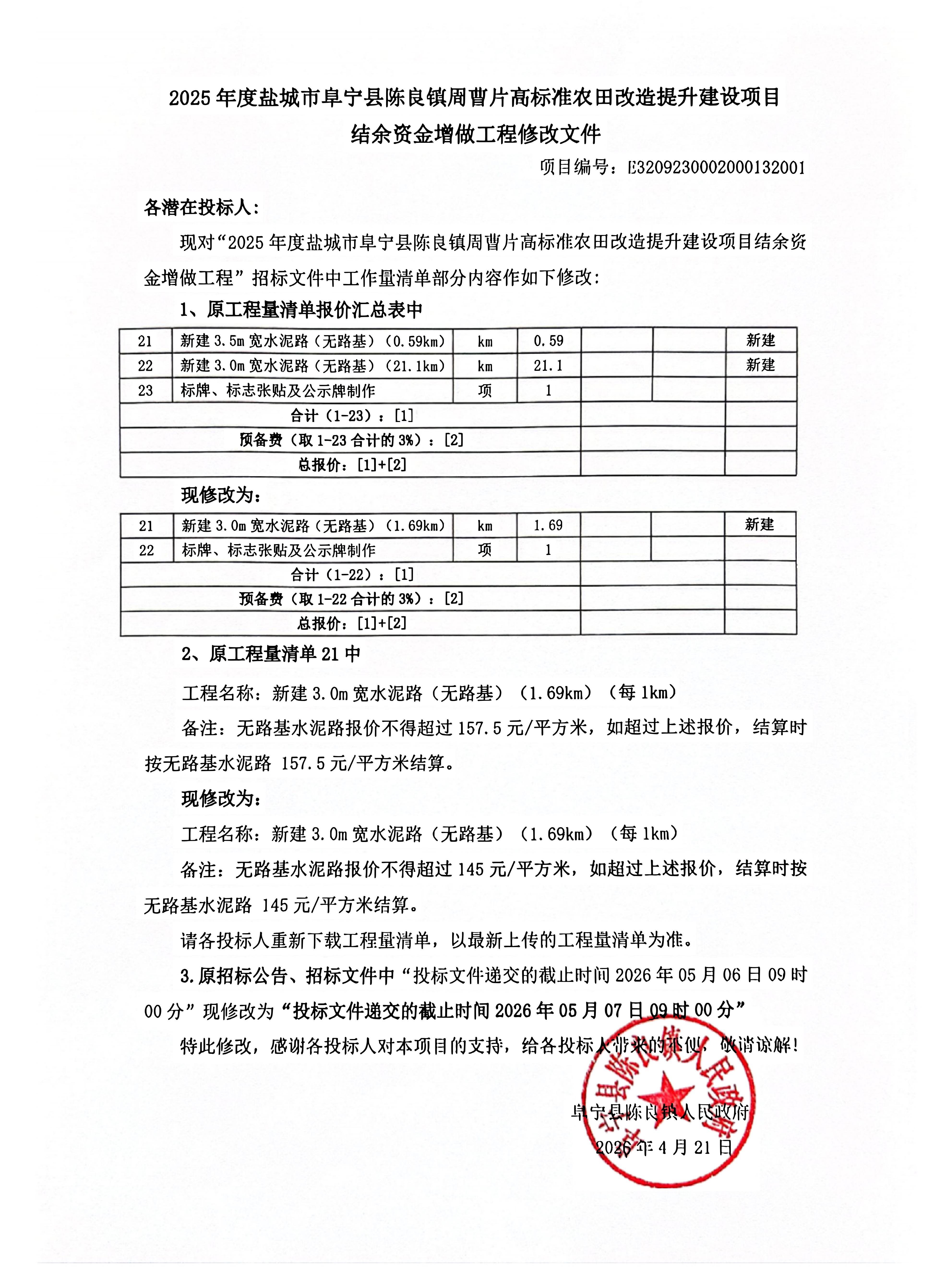 2025年度盐城市阜宁县陈良镇周曹片高标准农田改造提升建设项目结余资金增做工程