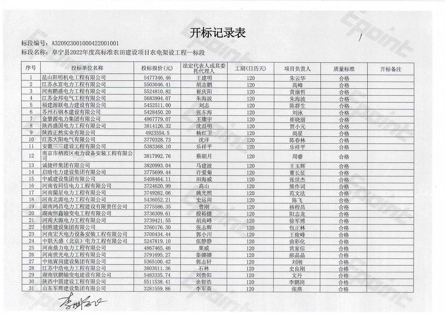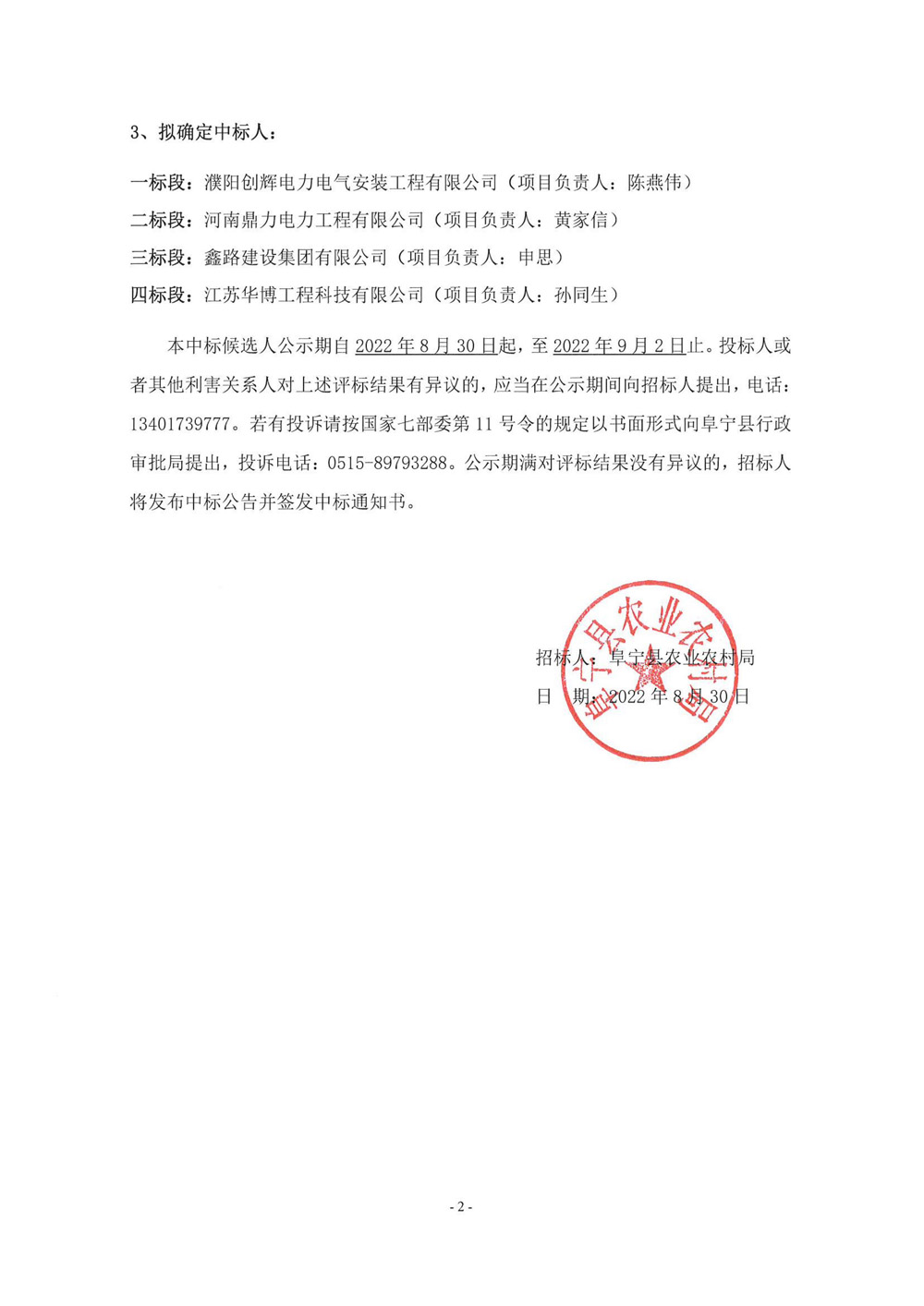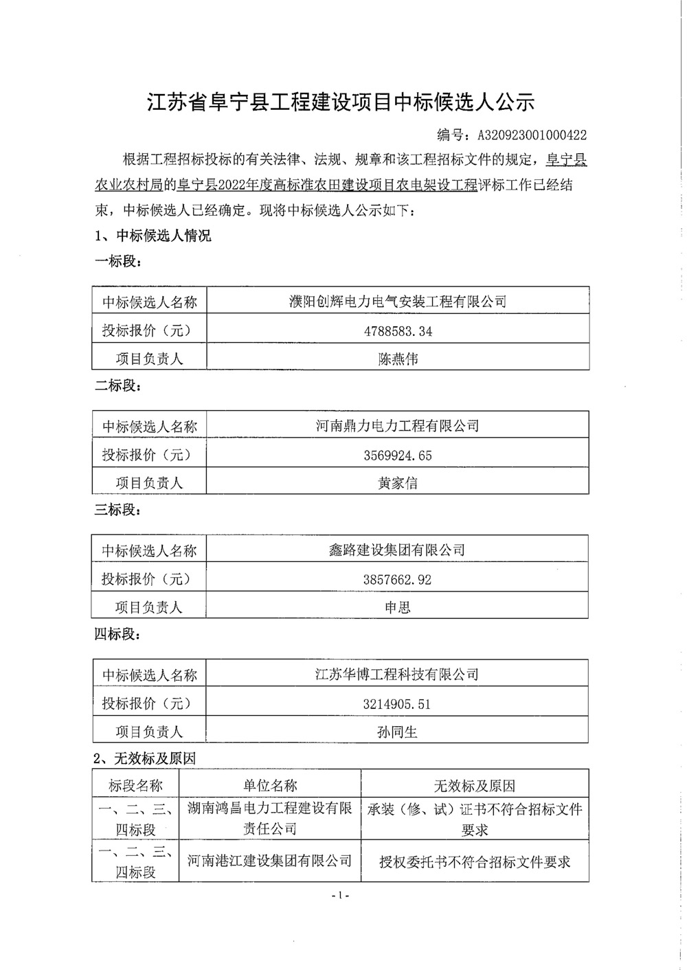 阜宁县2022年度高标准农田建设项目农电架设工程一标段中标候选人公示