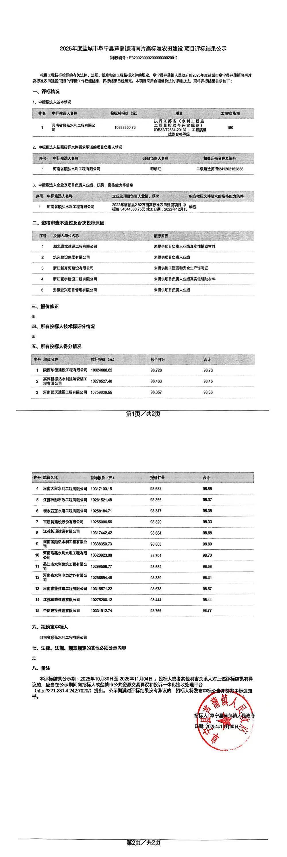 2025年度盐城市阜宁县芦蒲镇蒲南片高标准农田建设项目评标结果公示