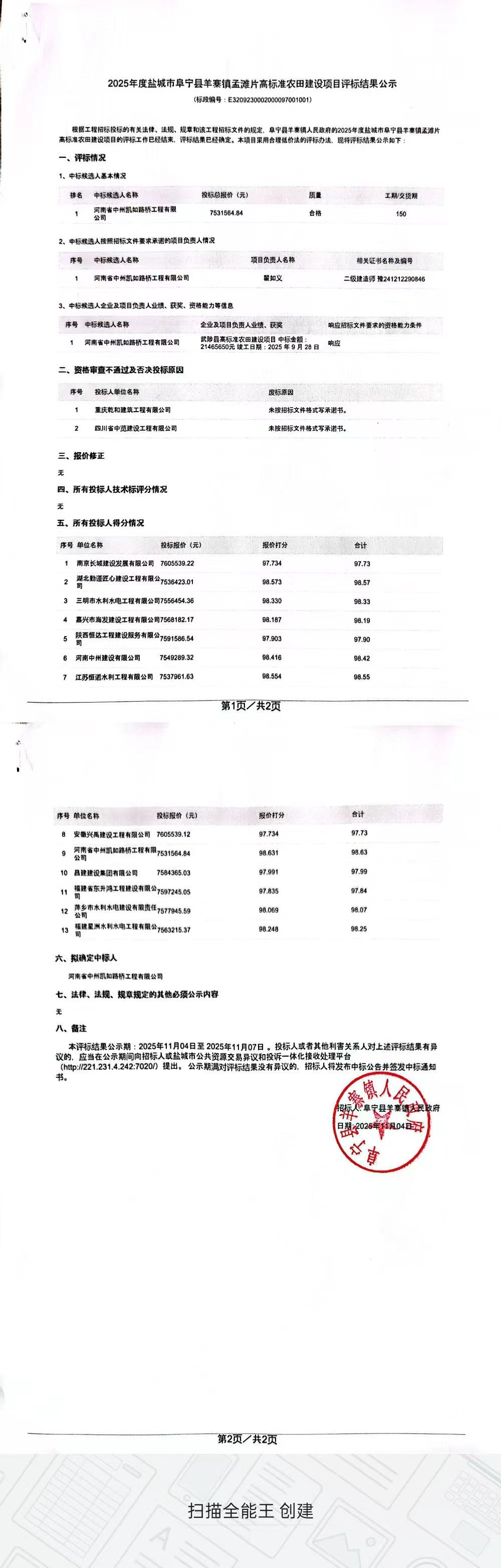 2025年度盐城市阜宁县羊寨镇孟滩片高标准农田建设项目评标结果公示