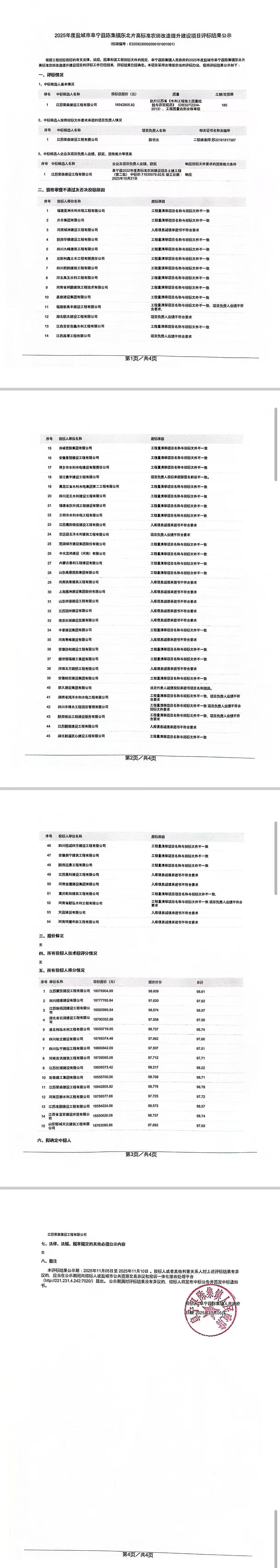 2025年度盐城市阜宁县陈集镇东北片高标准农田改造提升建设项目评标结果公示