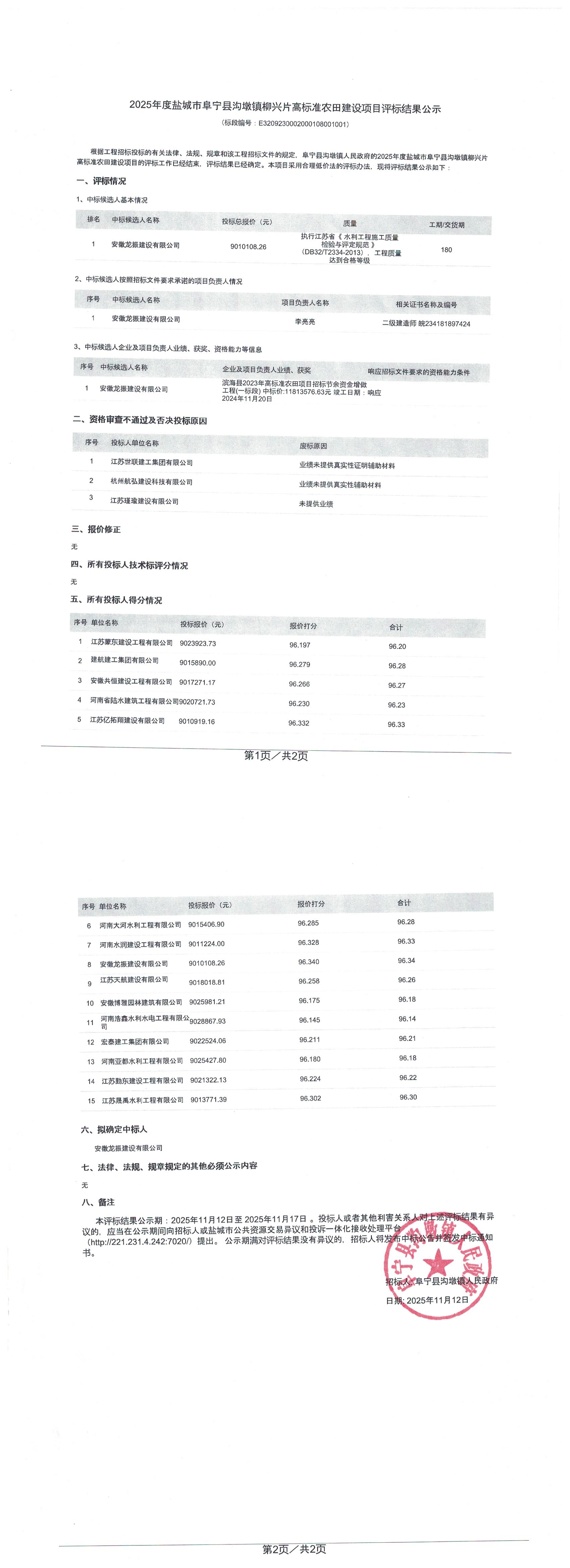 2025年度盐城市阜宁县沟墩镇柳兴片高标准农田建设项目评标结果公示