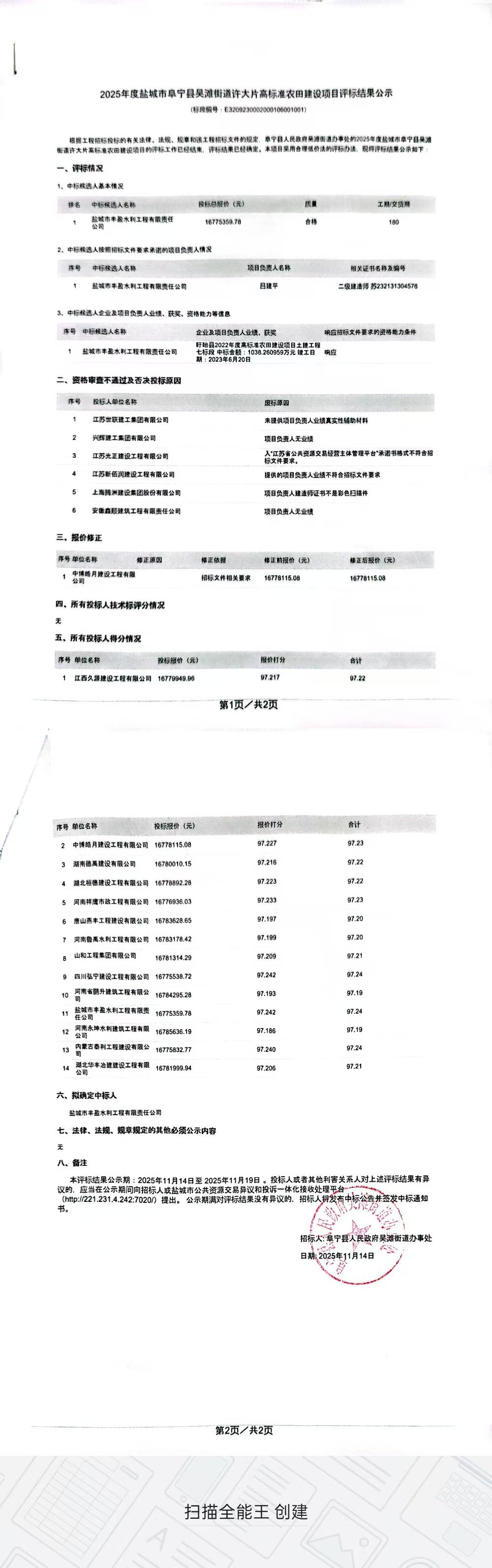 2025年度盐城市阜宁县吴滩街道许大片高标准农田建设项目评标结果公示