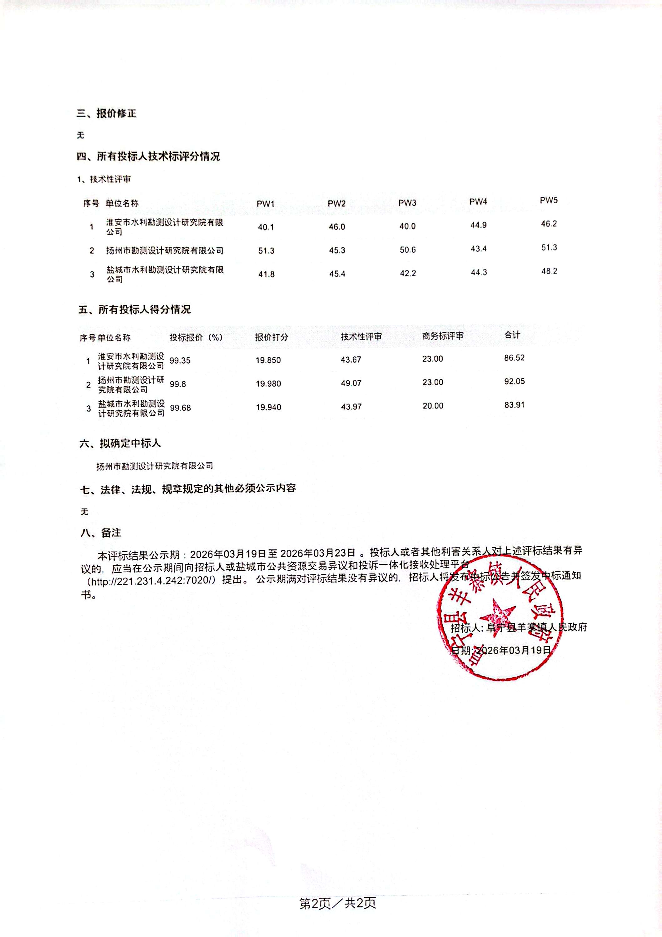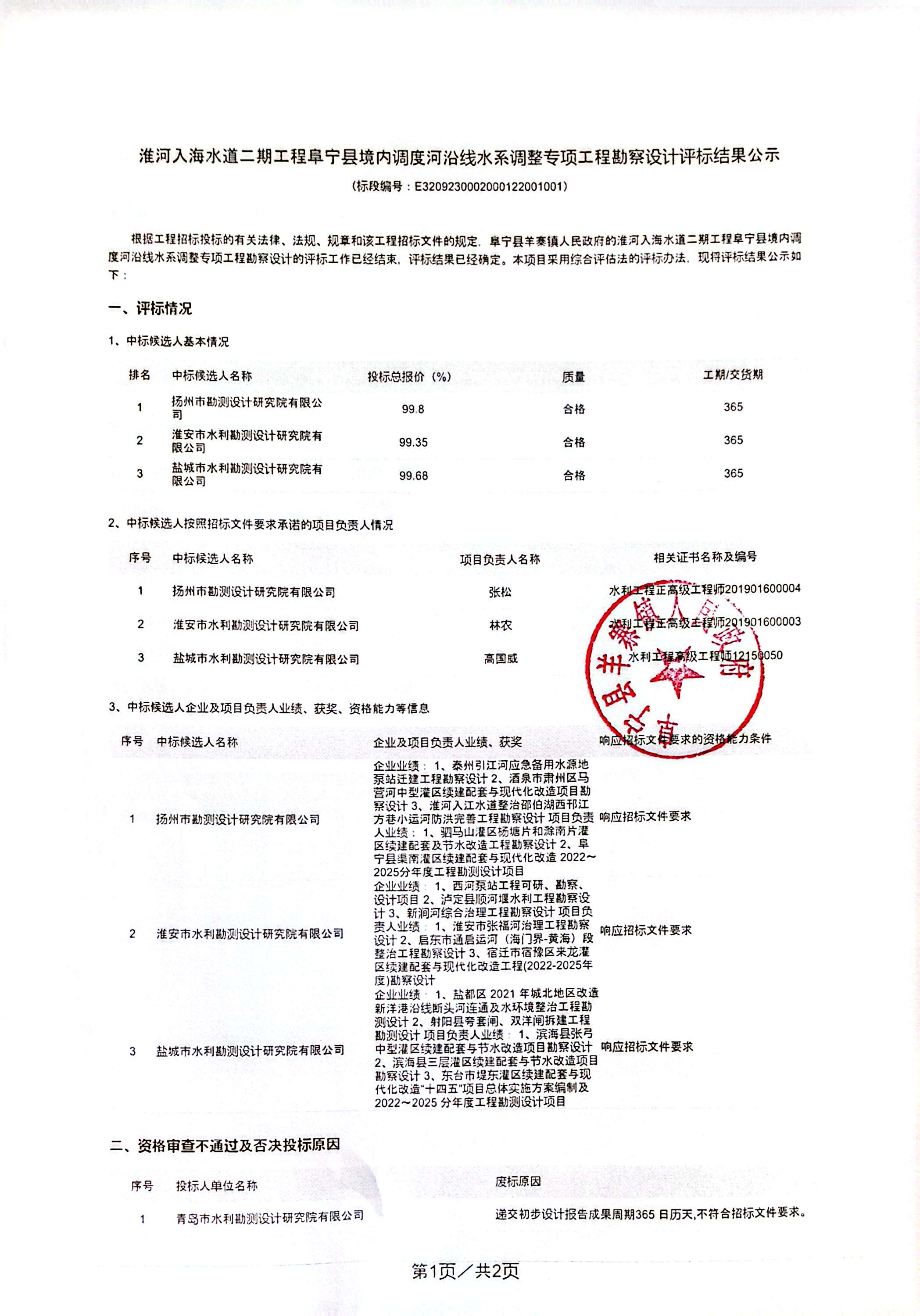淮河入海水道二期工程阜宁县境内调度河沿线水系调整专项工程勘察设计评标结果公示