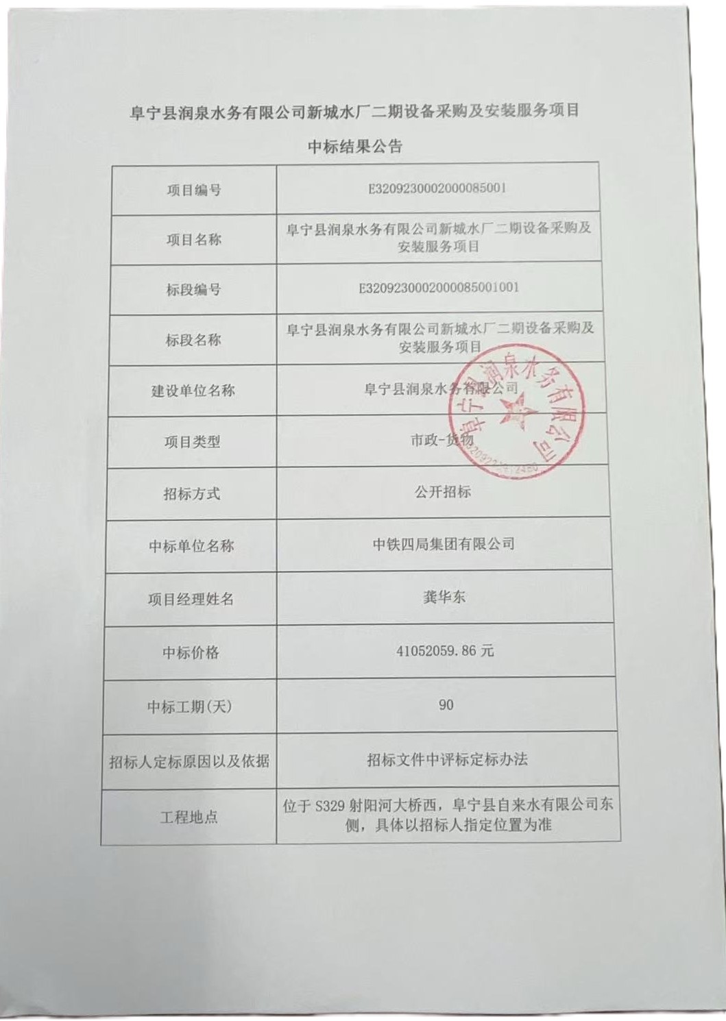 阜宁县润泉水务有限公司新城水厂二期设备采购及安装服务