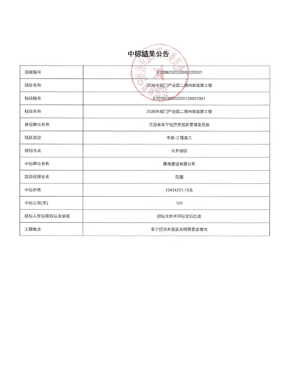 2026年阀门产业园二期内部道路工程中标结果公告