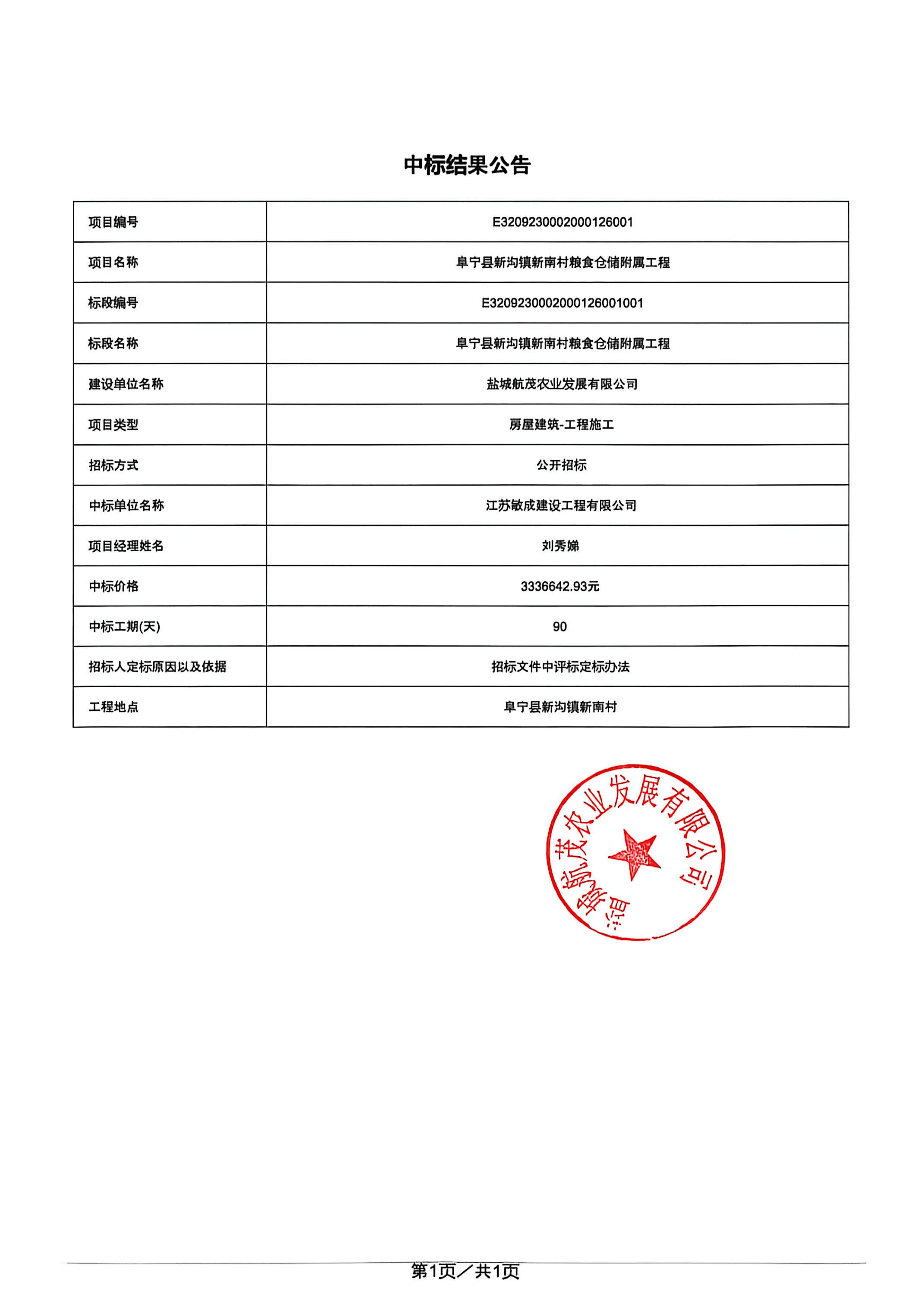 阜宁县新沟镇新南村粮食仓储附属工程中标结果公告