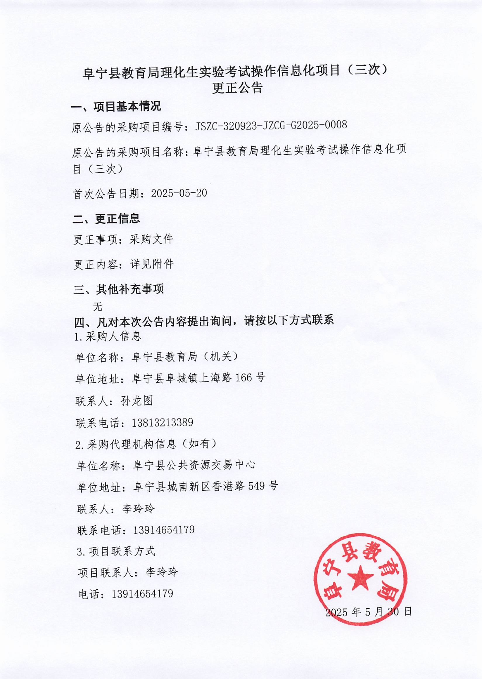阜宁县教育局理化生实验考试操作信息化项目(三次)更正公告