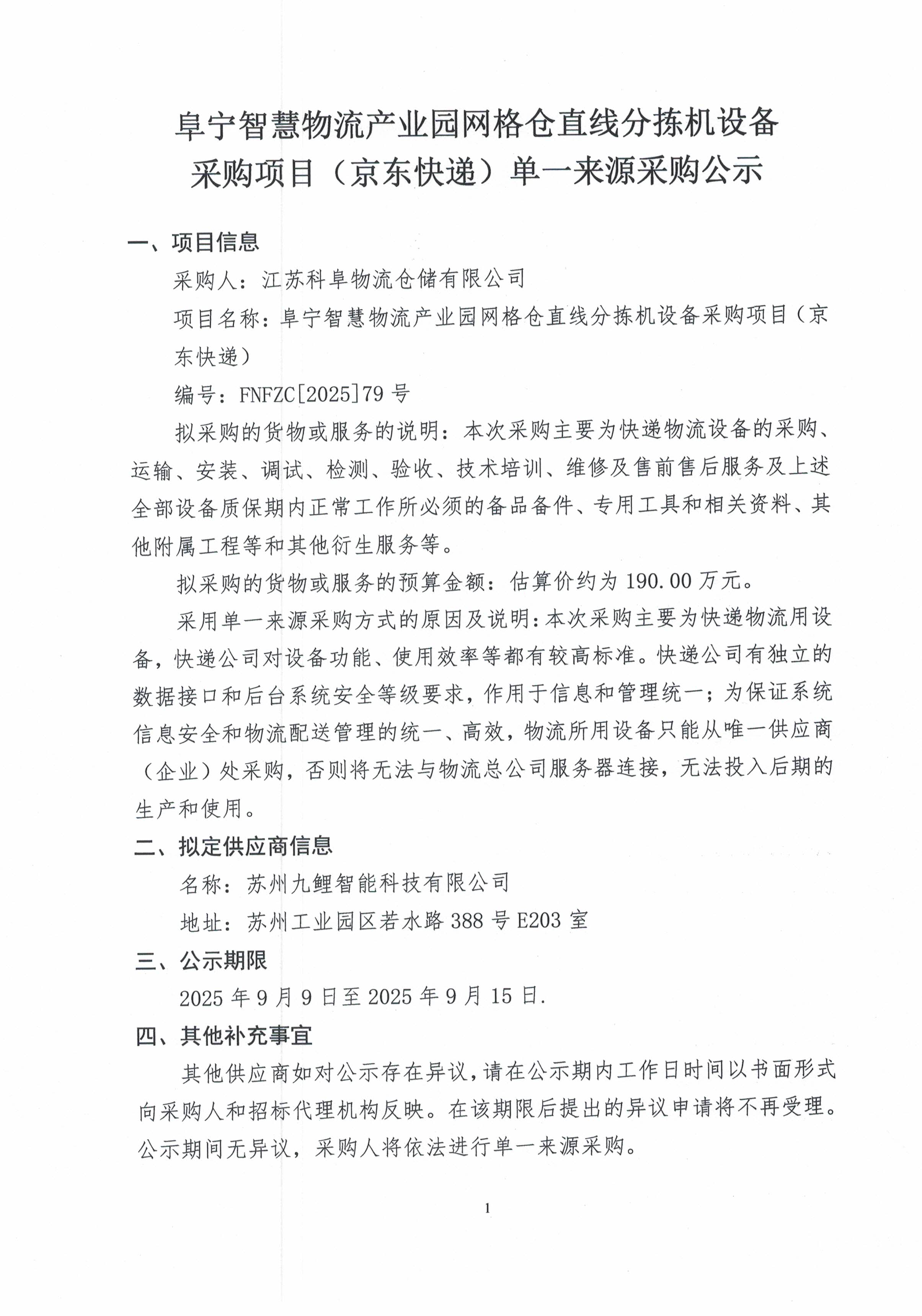 阜宁智慧物流产业园网格仓直线分拣机设备采购项目(京东快递)单一来源采购公示