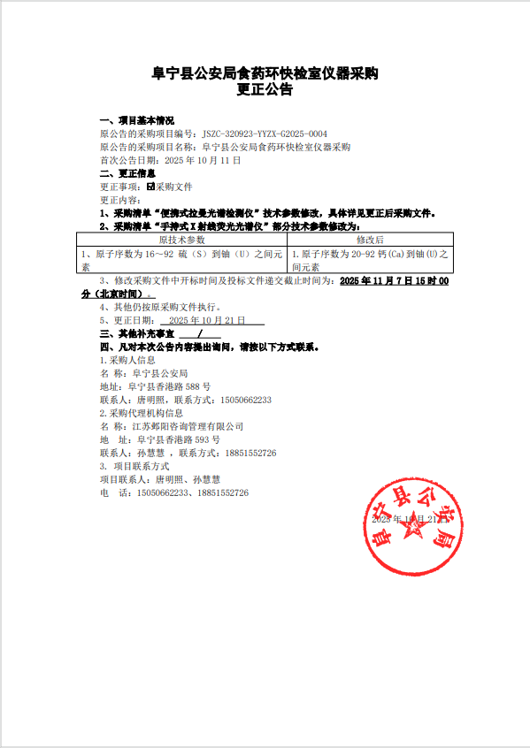 阜宁县公安局食药环快检室仪器采购更正公告