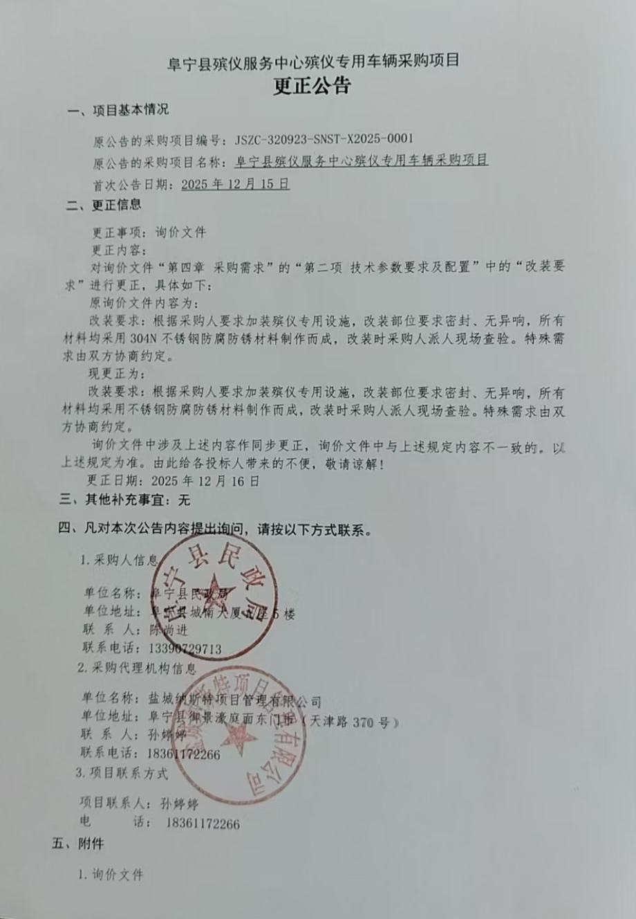 阜宁县殡仪服务中心殡仪专用车辆采购项目更正公告