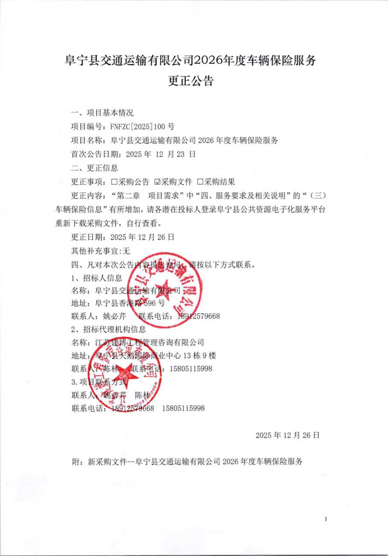 阜宁县交通运输有限公司2026年度车辆保险服务更正公告