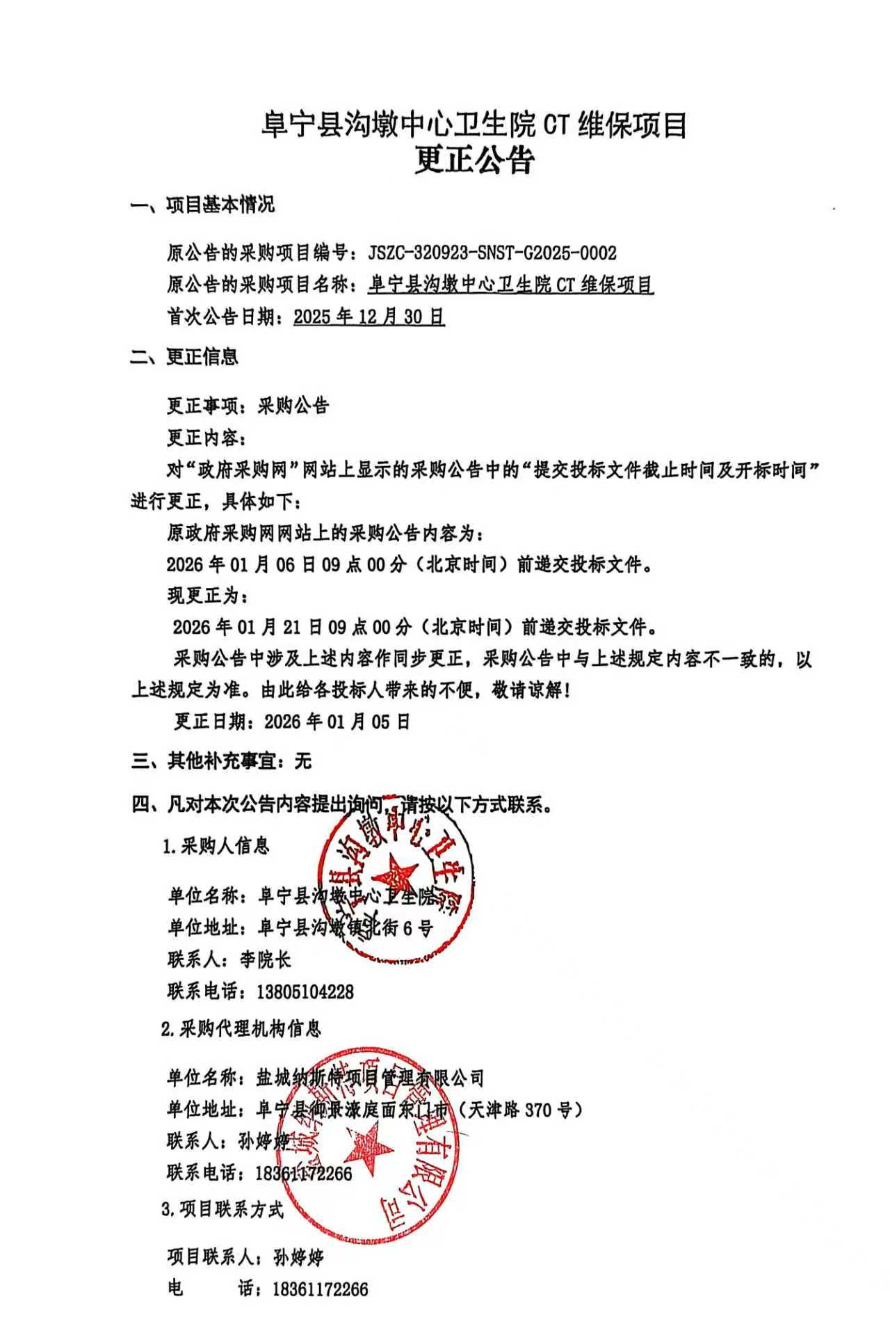阜宁县沟墩中心卫生院 CT 维保项目更正公告