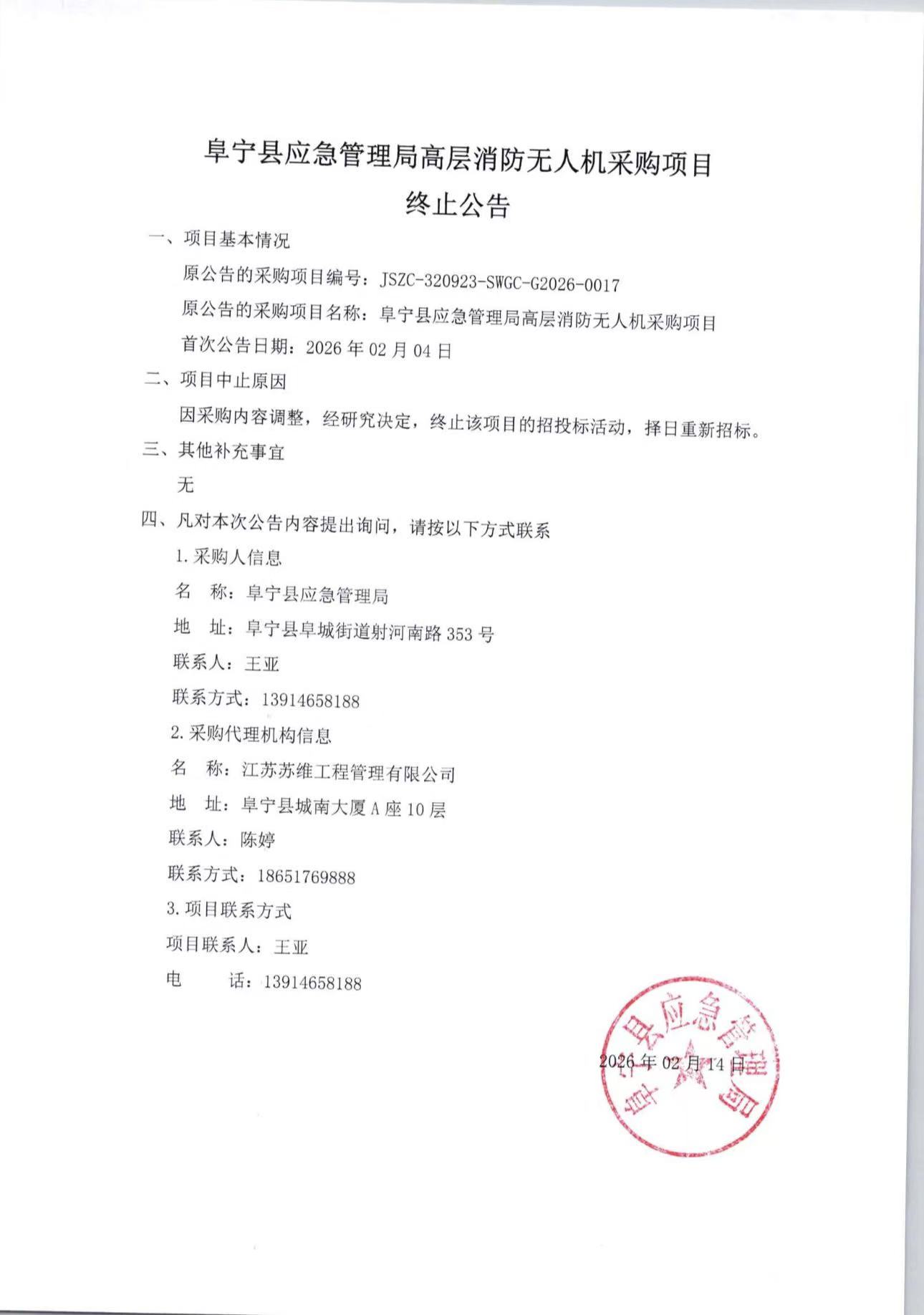 阜宁县应急管理局高层消防无人机采购项目终止公告