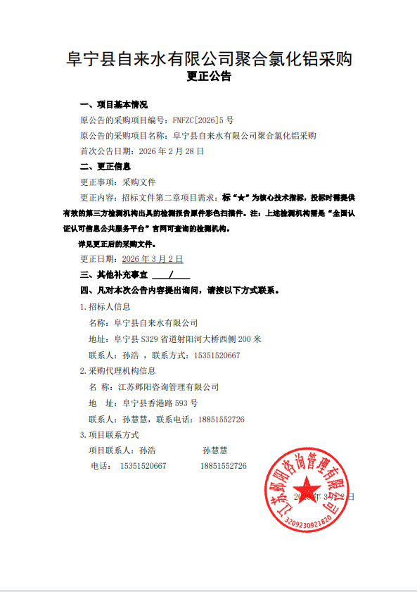 阜宁县自来水有限公司聚合氯化铝采购更正公告
