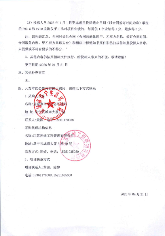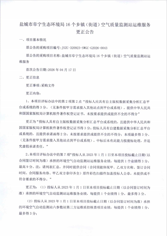 盐城市阜宁生态环境局16个乡镇(街道)空气质量监测站运维服务更正公告