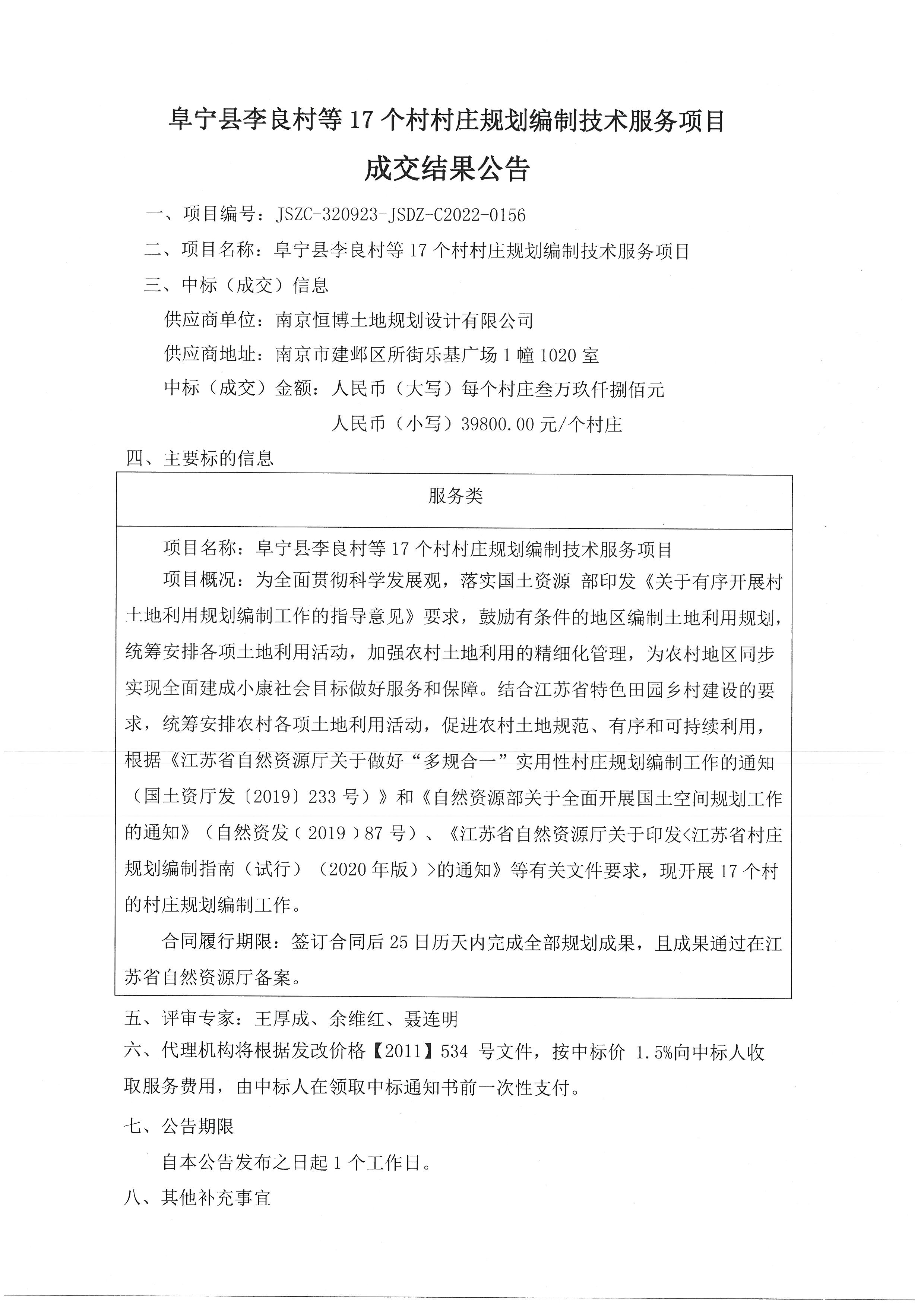 阜宁县李良村等17个村村庄规划编制技术服务项目