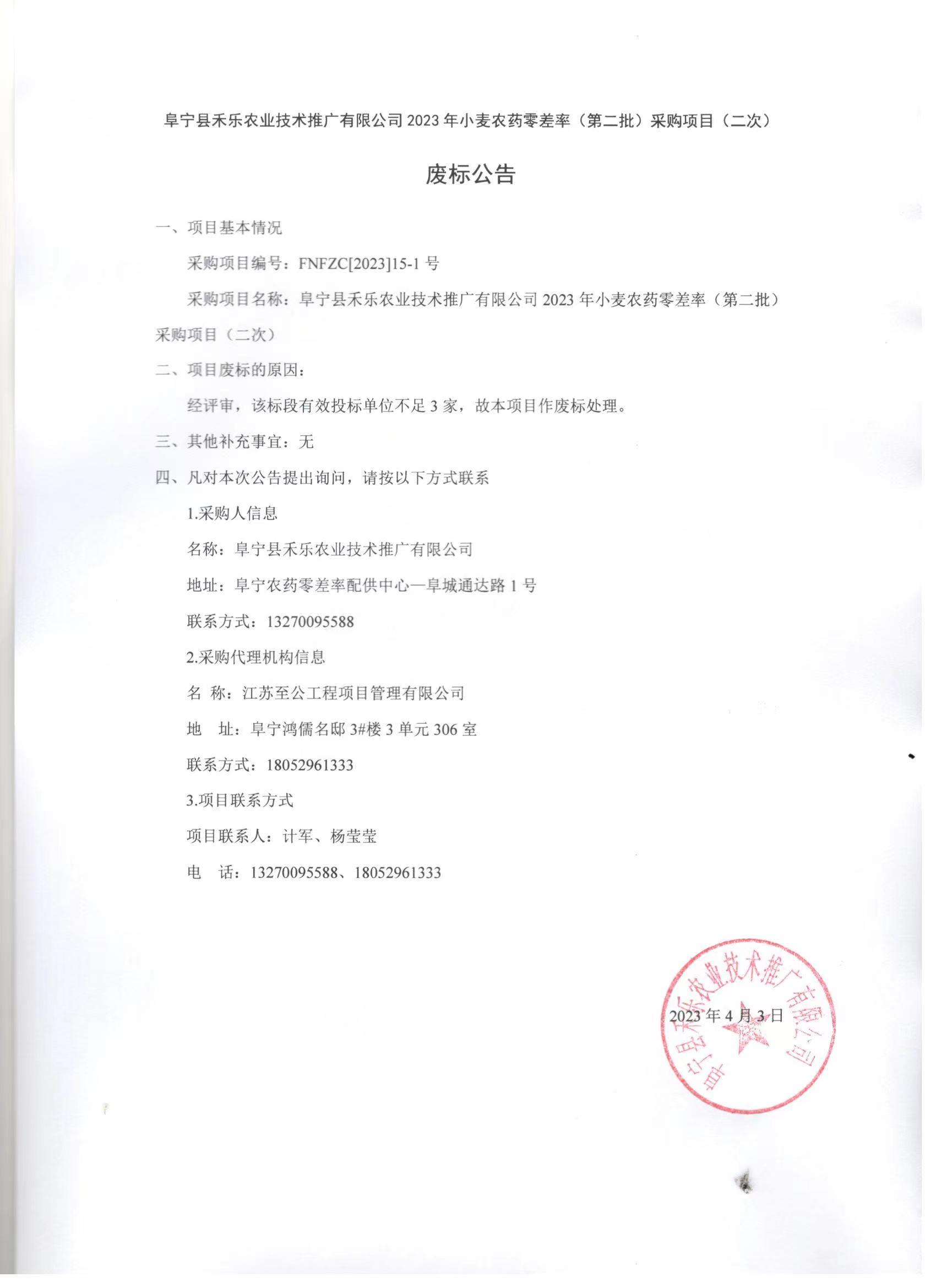 阜宁县禾乐农业技术推广有限公司2023年小麦农药零差率(第二批)采购项目(八标段)废标公告