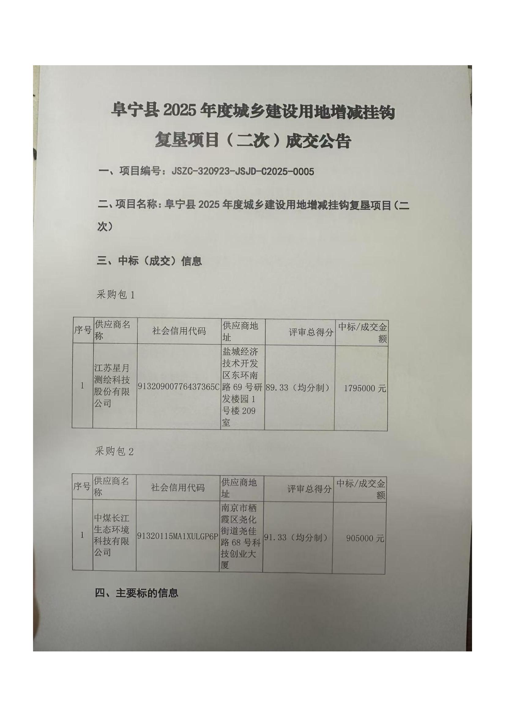 阜宁县2025年度乡建设地钩复垦项目(二次)成交公告