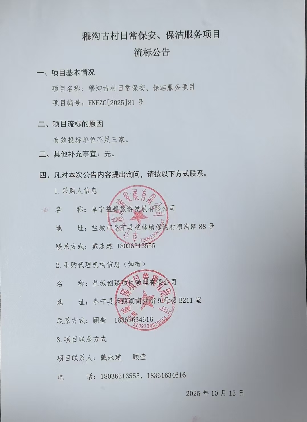 穆沟古村日常保安、保洁服务项目 废标公告