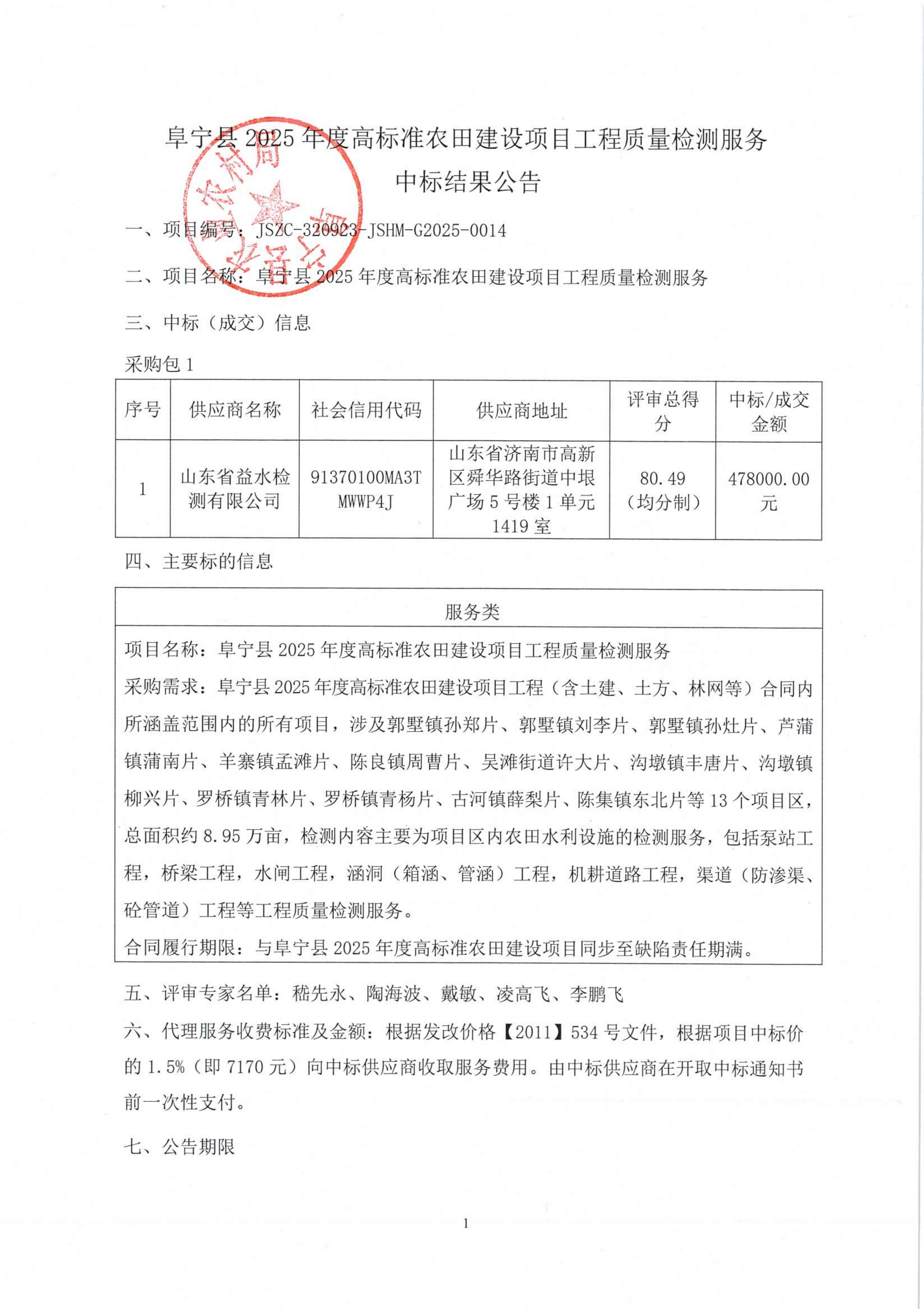 阜宁号2025年度高标准农田建设项目工程质量检测服务中标结果公告