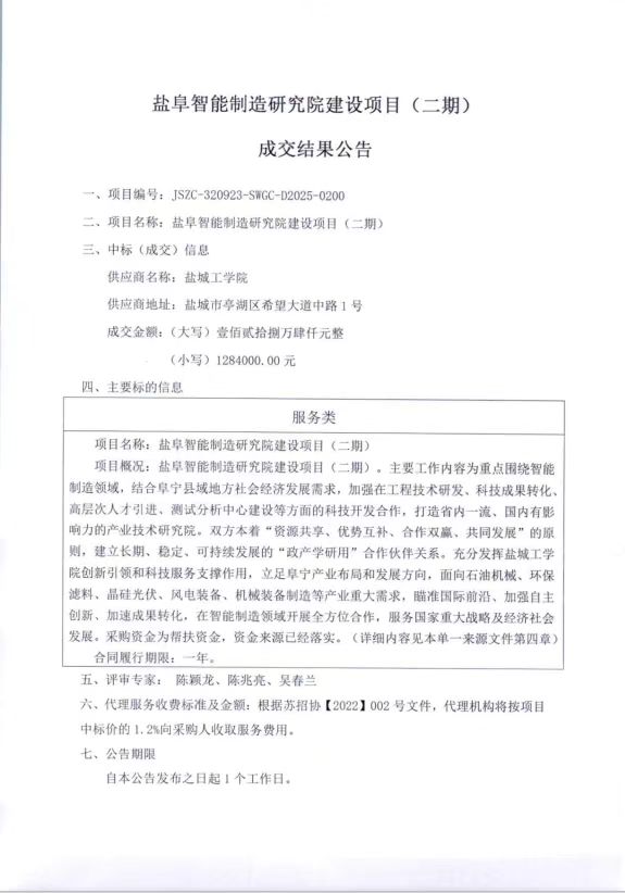 盐阜智能制造研究院建设项目(二期)成交结果公告