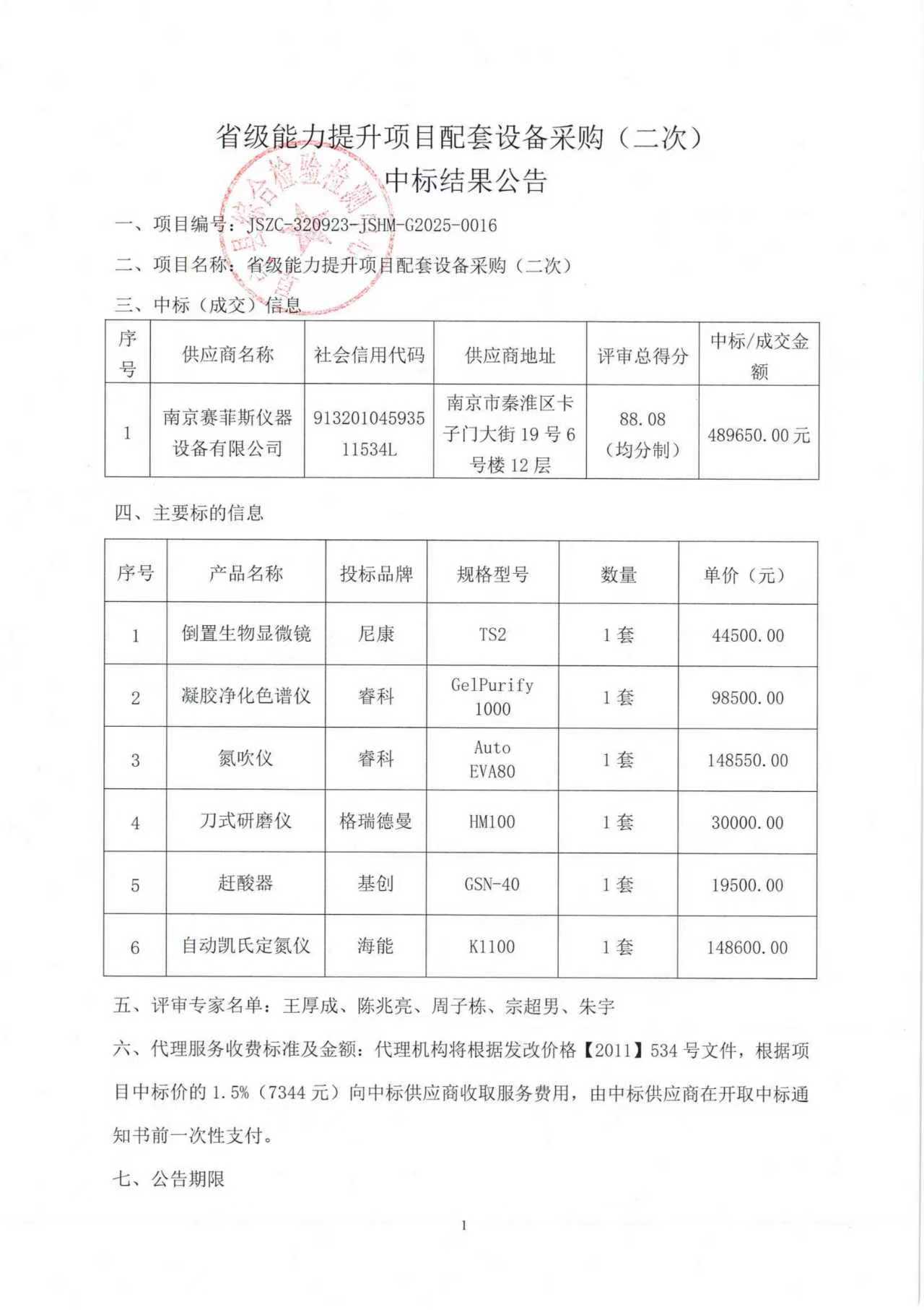 省级能力提升项目配套设备采购(二次)中标结果公告