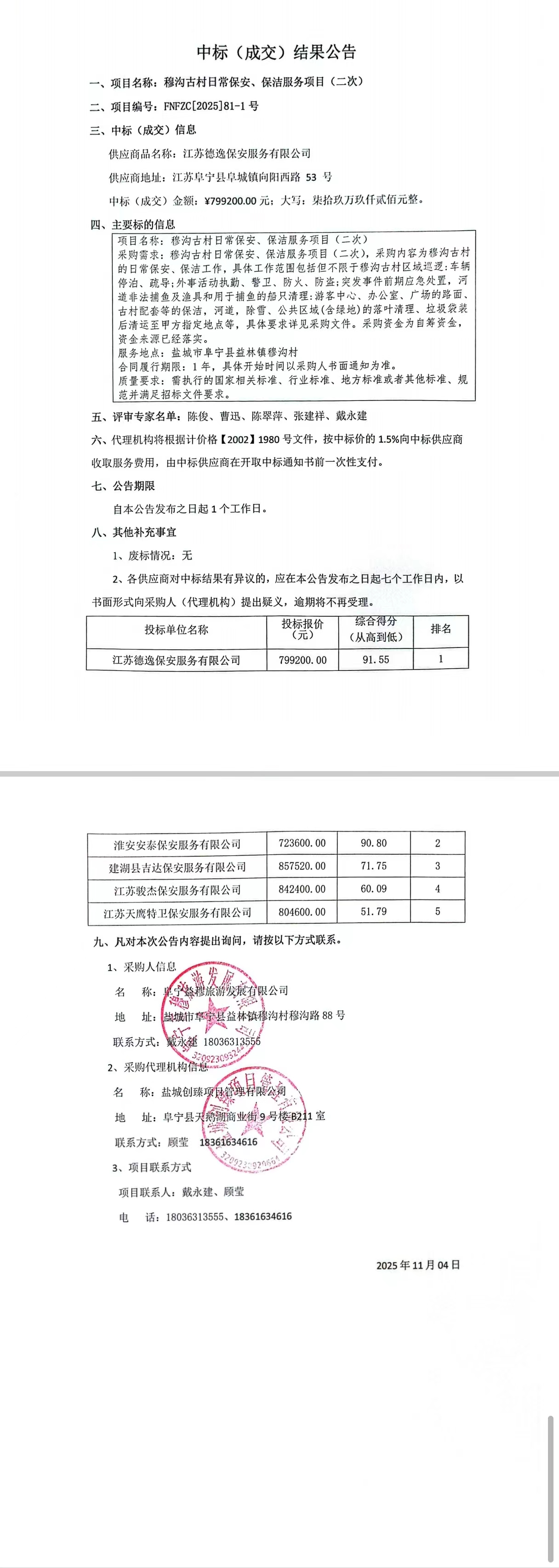 穆沟古村日常保安、保洁服务项目(二次)中标(成交)结果公告