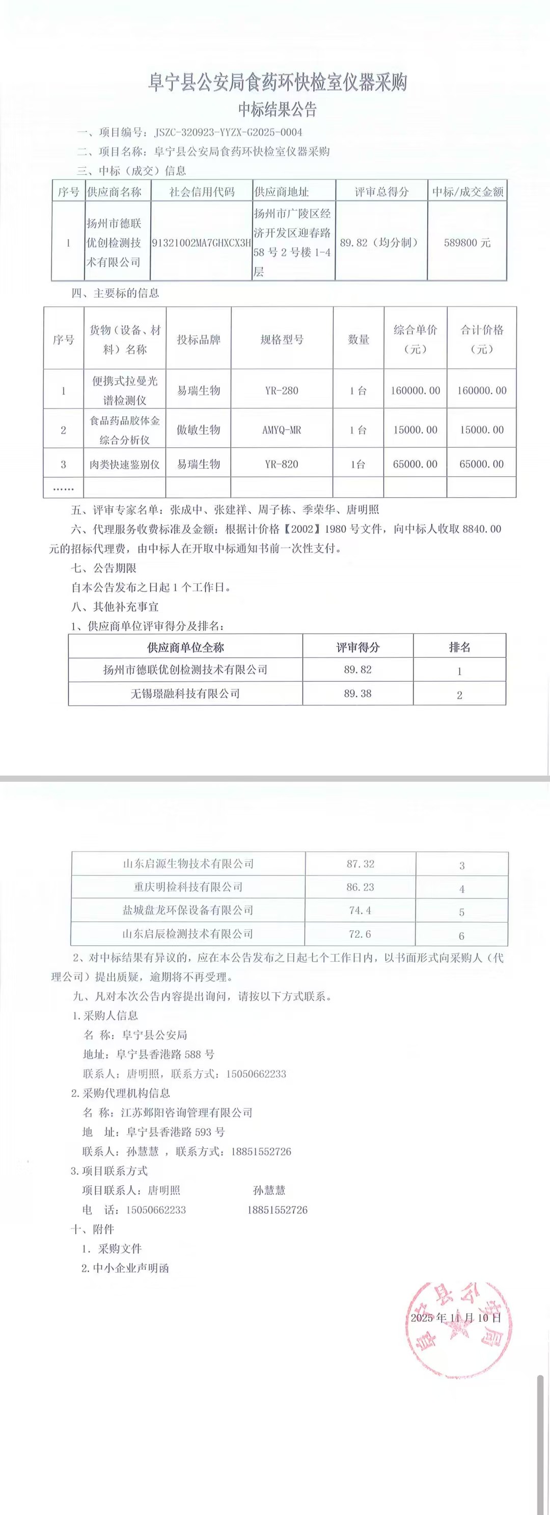 阜宁县公安局食药环快检室仪器采购中标结果公告