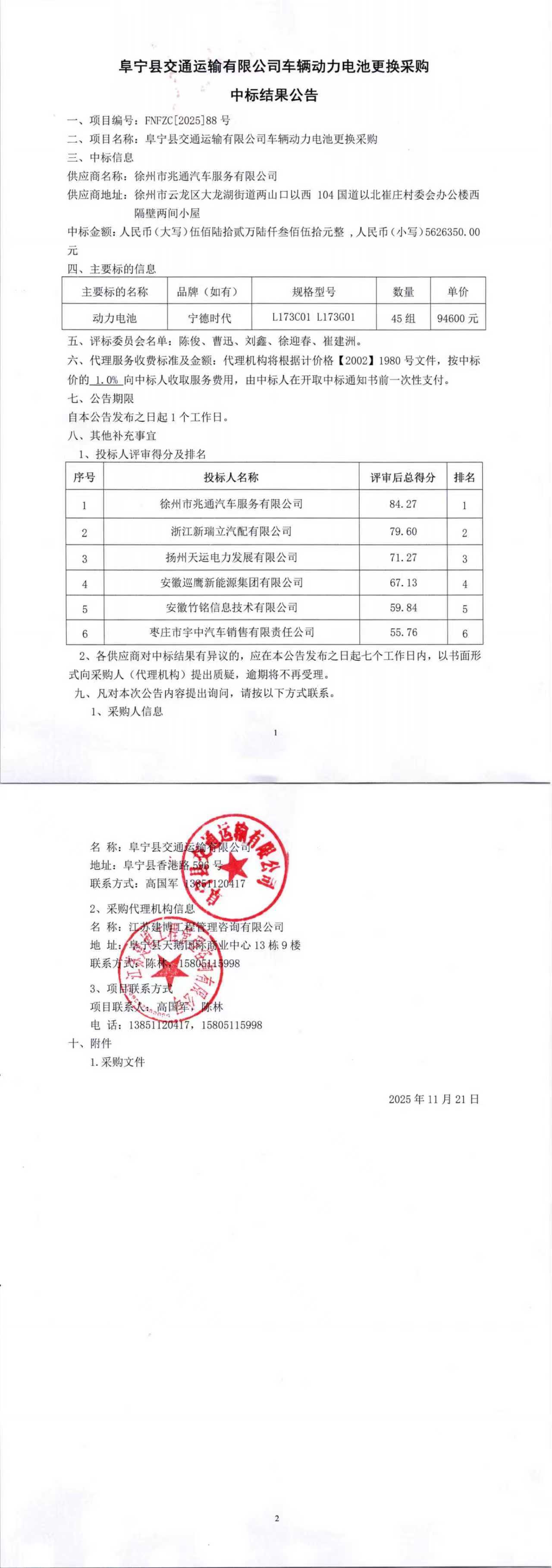 阜宁县交通运输有限公司车辆动力电池更换采购 中标结果公告