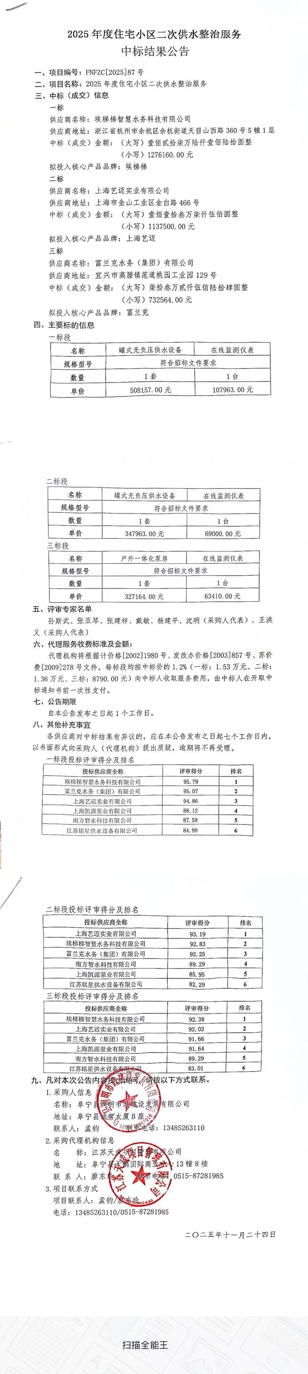 2025年度住宅小区二次供水整治服务 中标结果公告