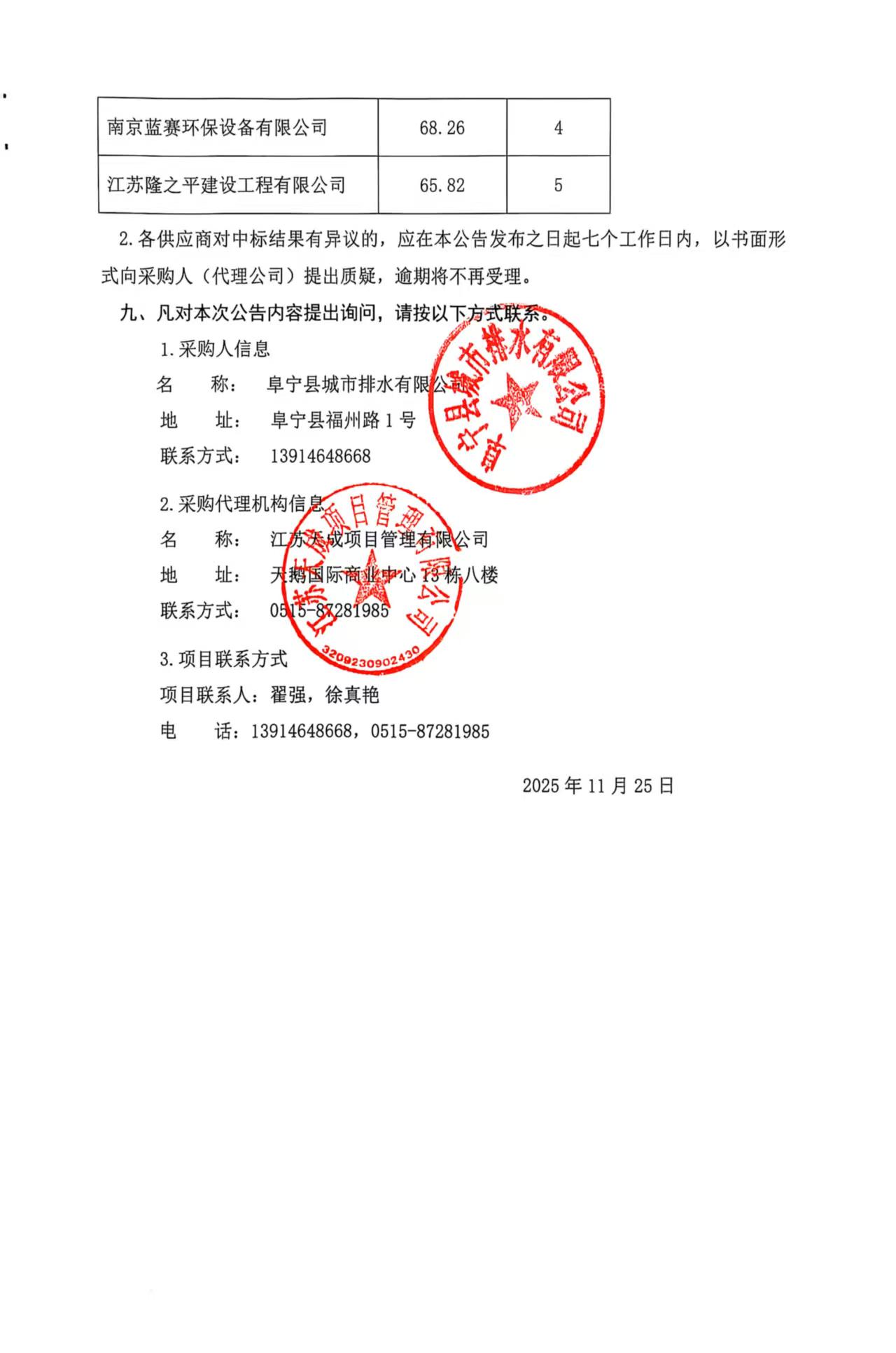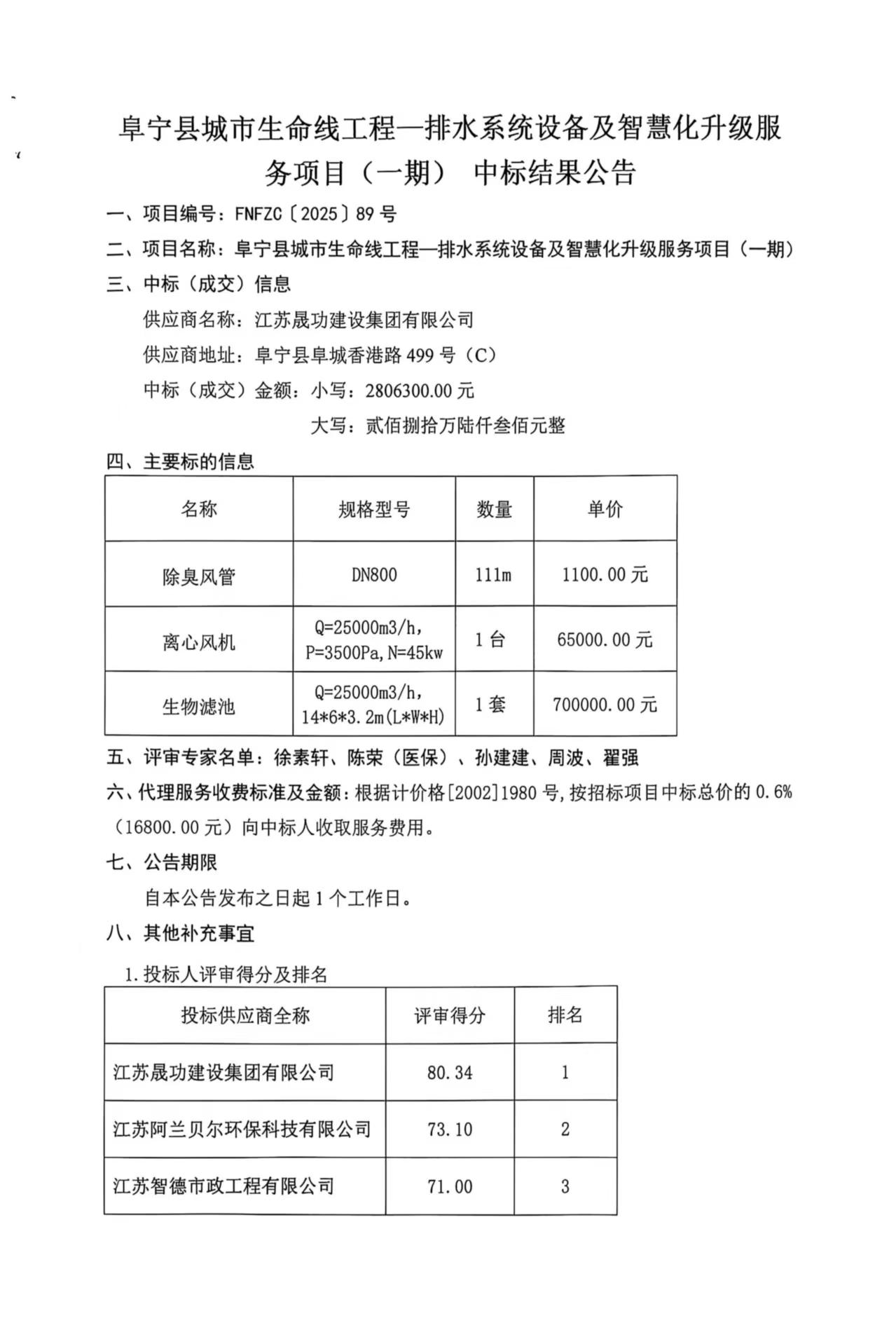 阜宁县城市生命线工程——排水系统设备及智慧化升级服务项目(一期)中标结果公告
