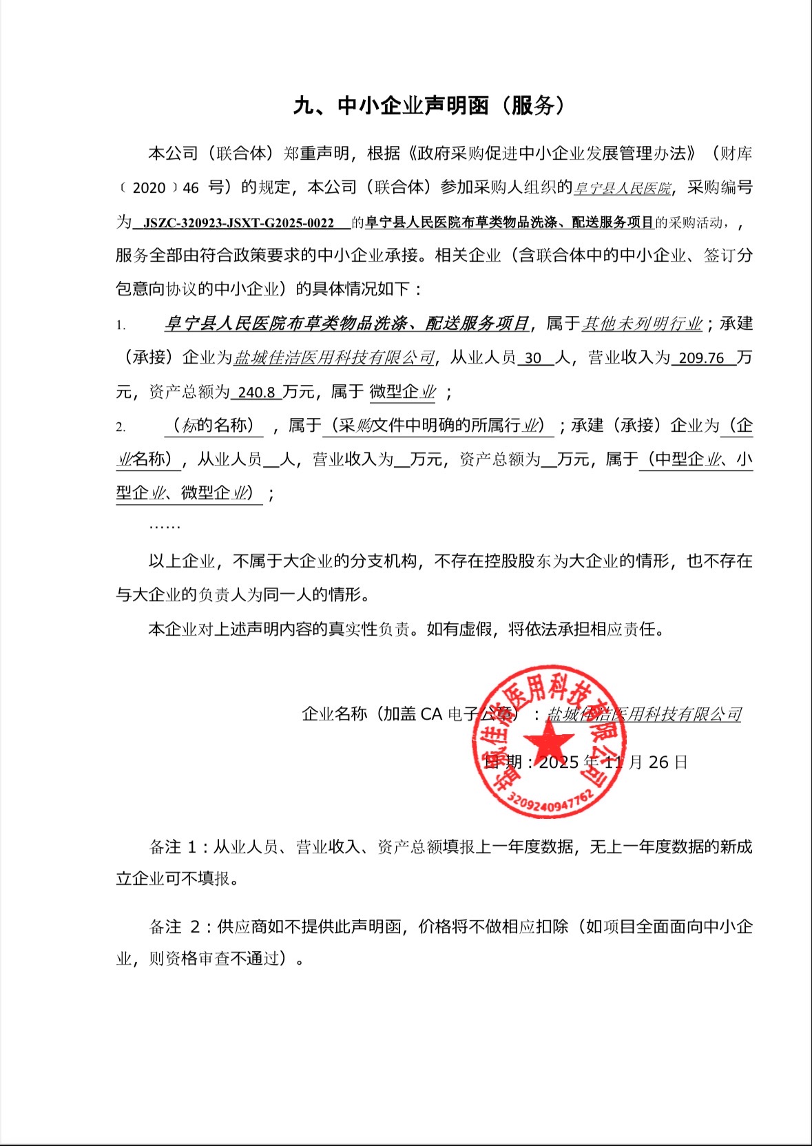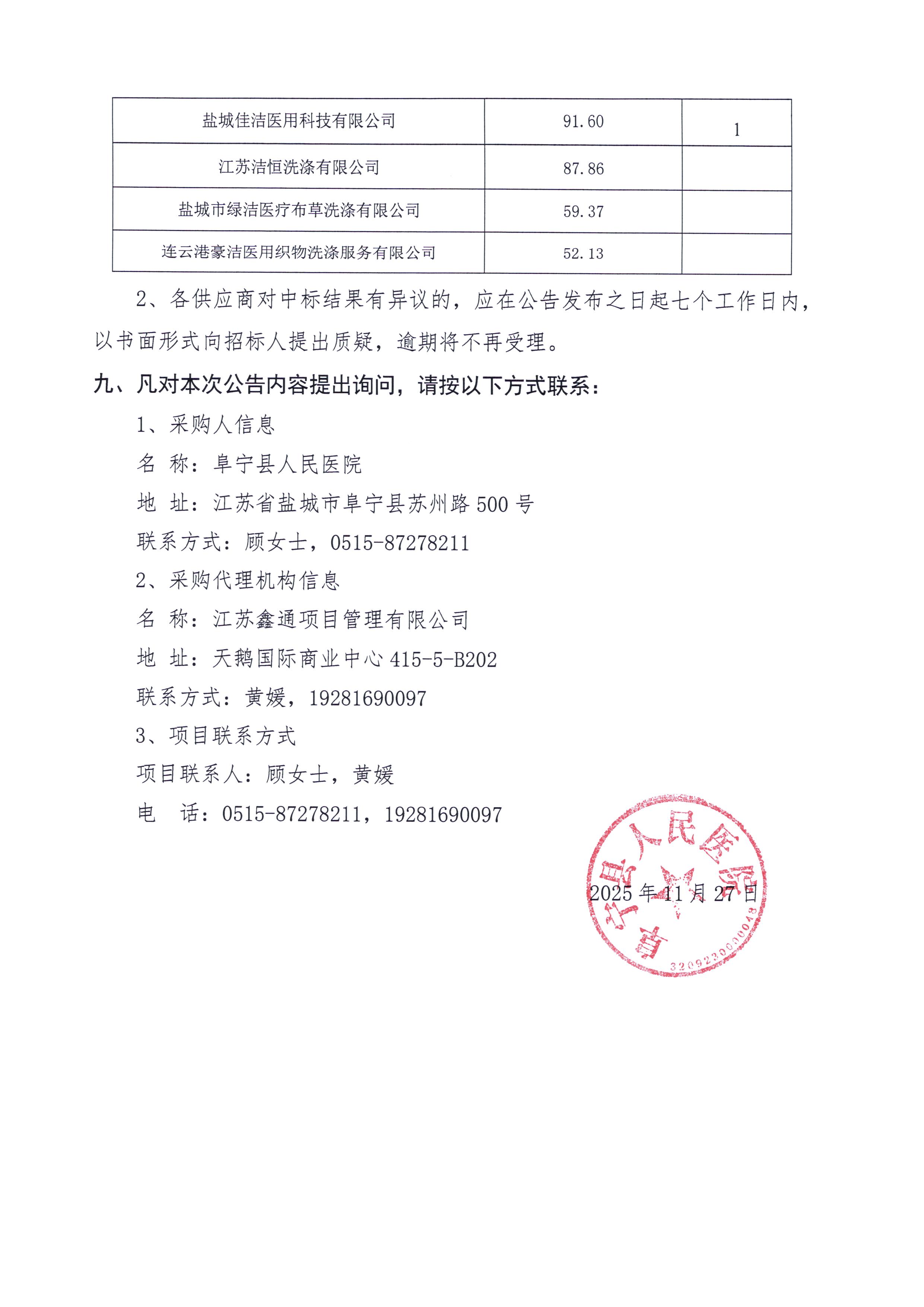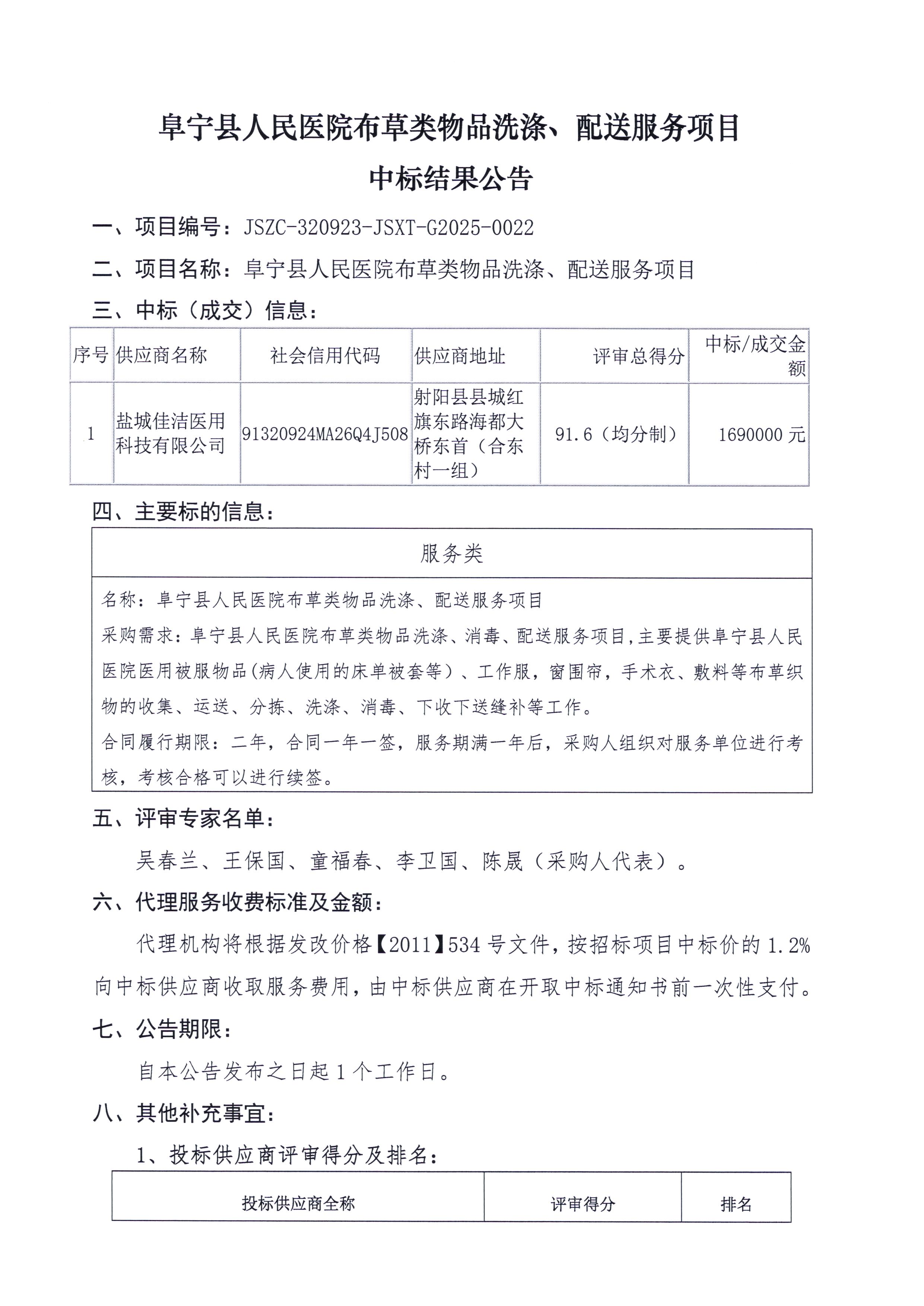 阜宁县人民医院布草类物品洗涤、配送服务项目中标结果公告