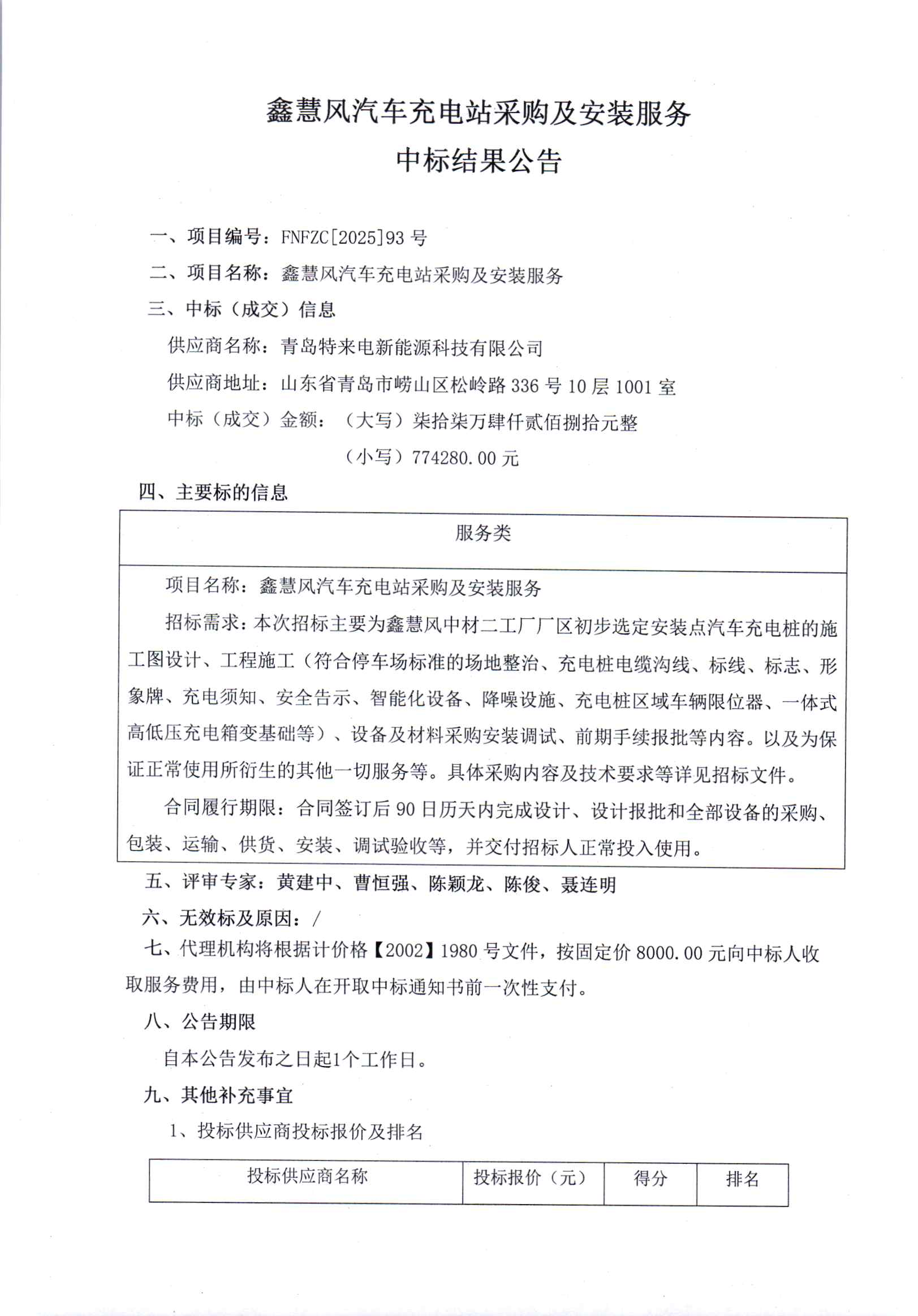 鑫慧风汽车充电站采购及安装服务 中标结果公告