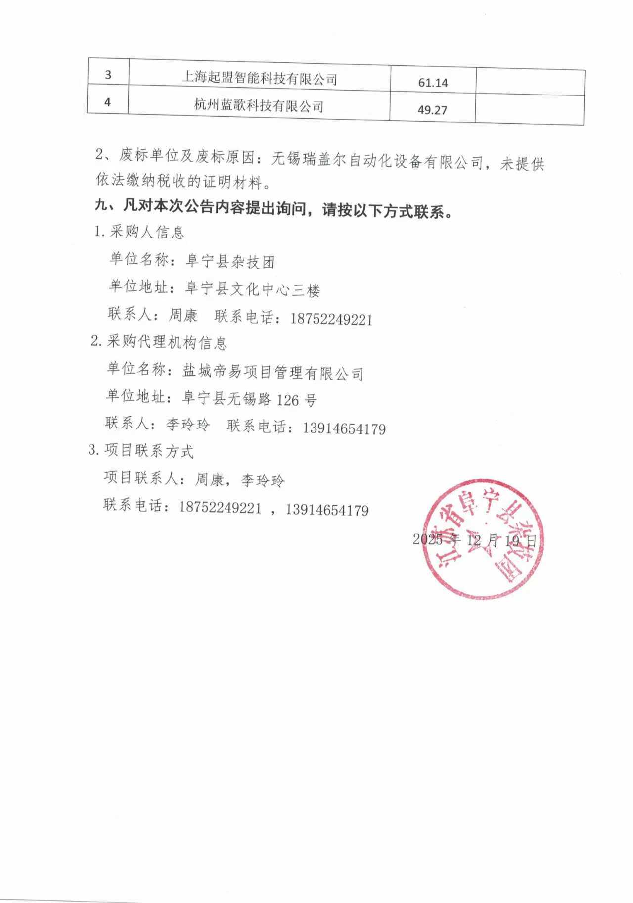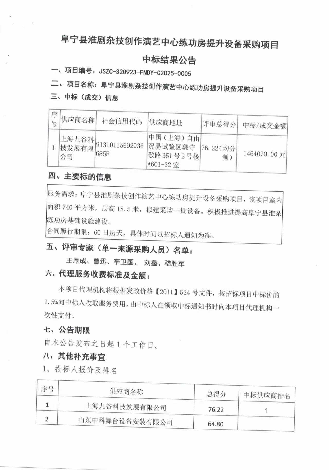 阜宁县淮剧杂技创作演艺中心练功房提升设备采购项目中标结果公告