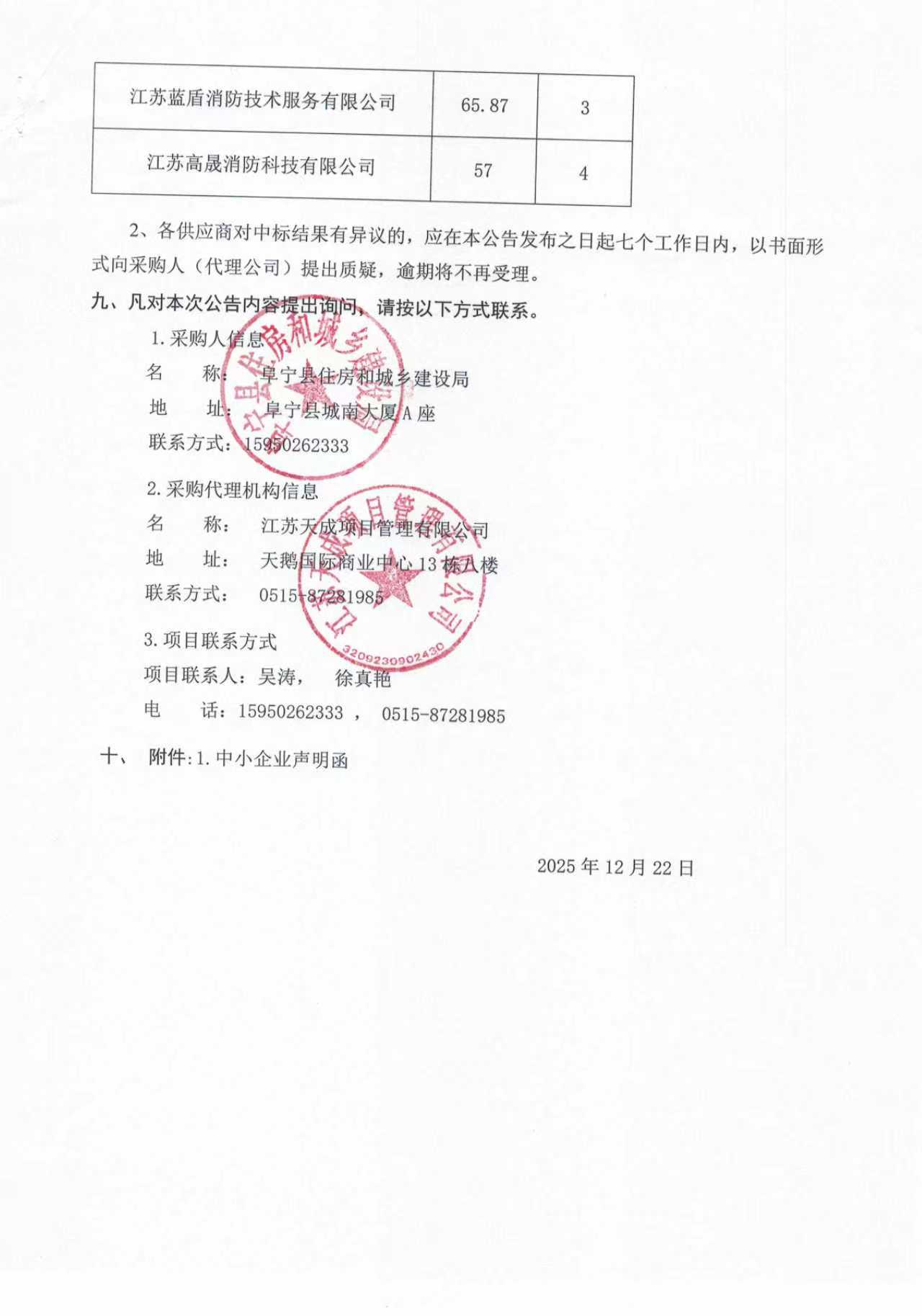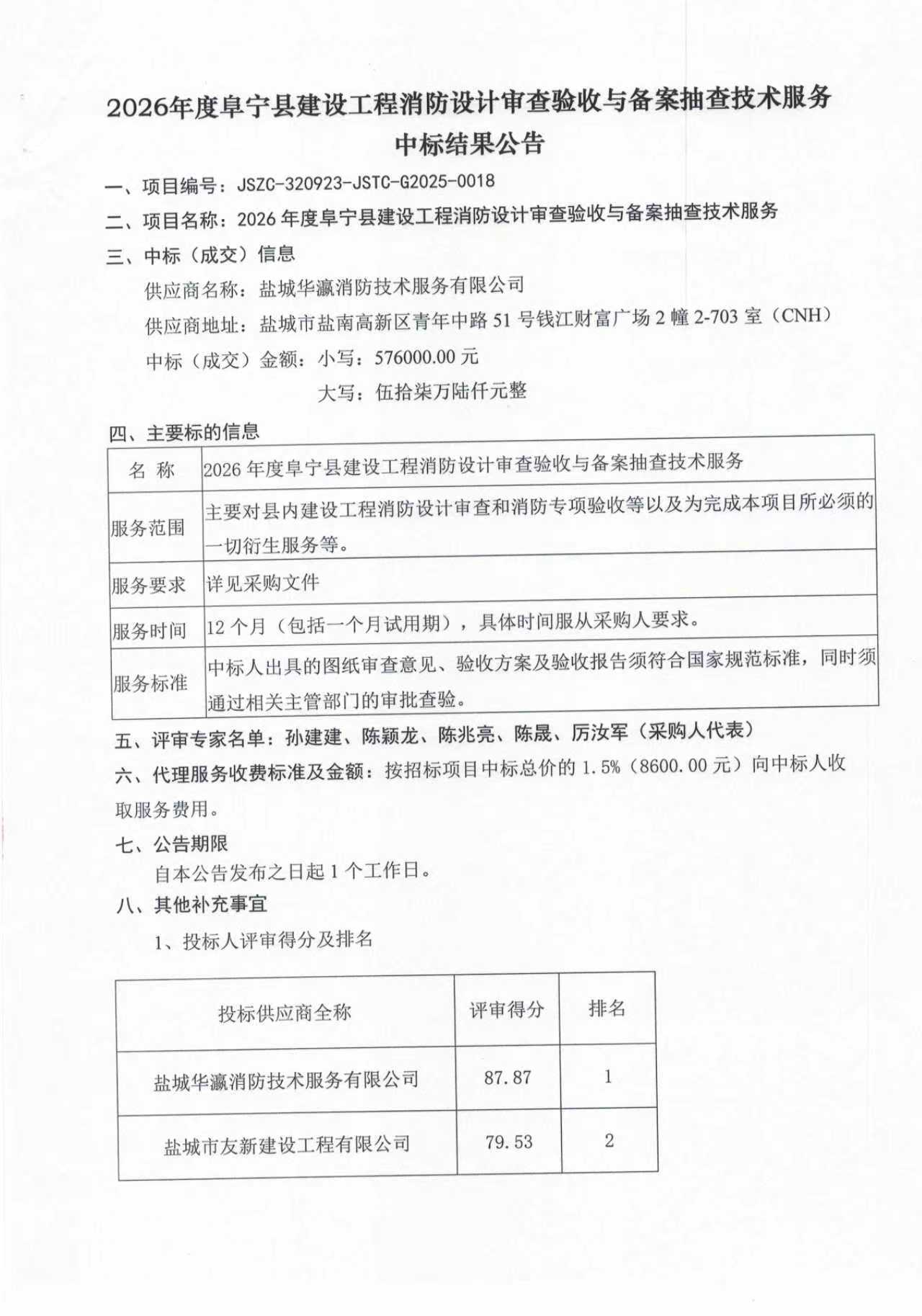 2026年度阜宁县建设工程消防设计审查验收与备案抽查技术服务中标结果公告