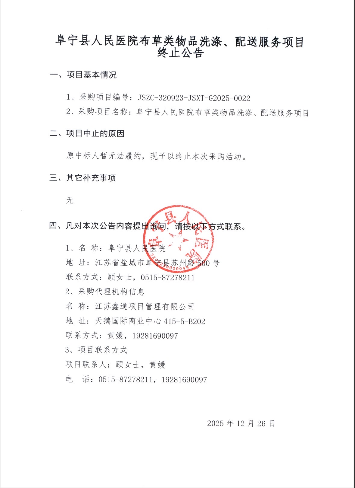 阜宁县人民医院布草类物品洗涤、配送服务项目终止公告