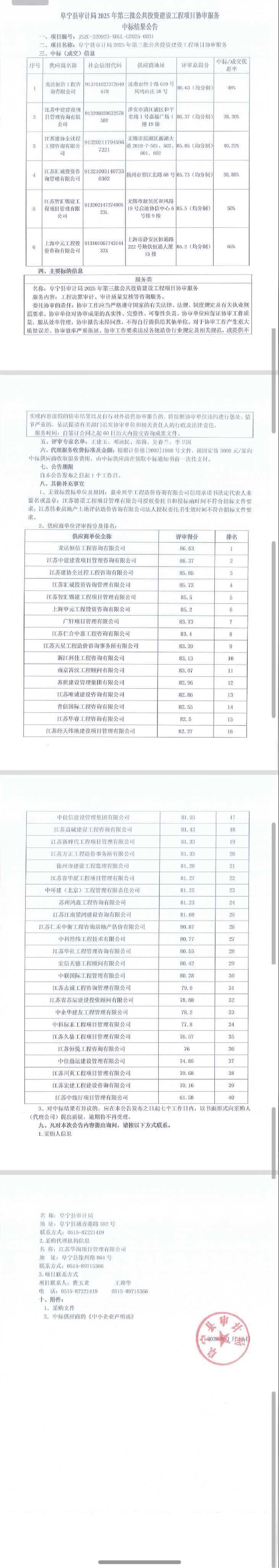 阜宁县审计局2025年第三批公共投资建设工程项目协审服务中标结果公告