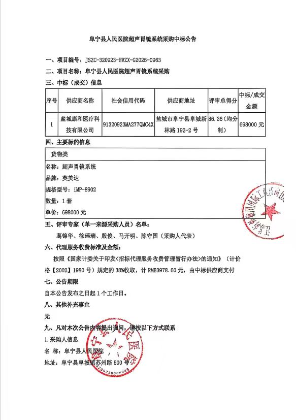阜宁县人民医院超声周镜系统采购中标公告