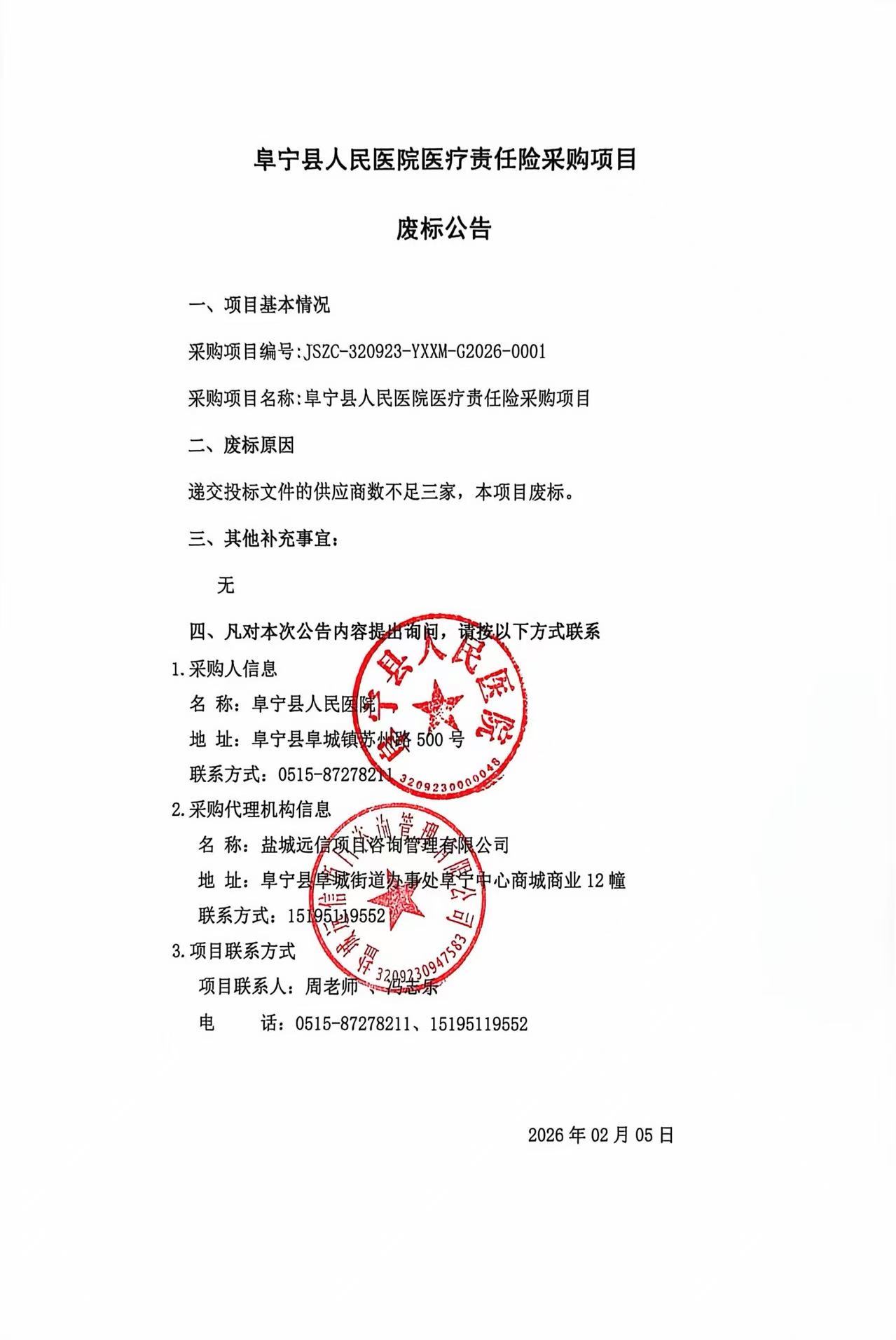 阜宁县人民医院医疗责任险采购项目废标公告