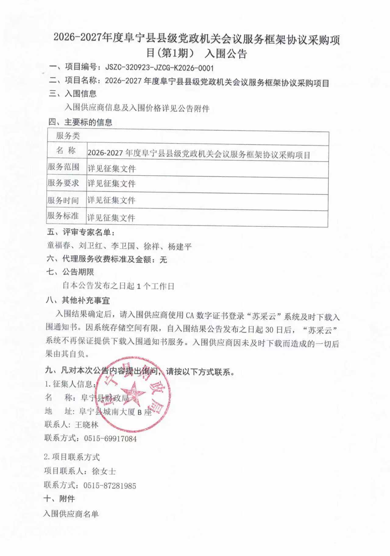 2026-2027年度阜宁县县级党政机关会议服务框架协议采购项目(第1期)入围公告