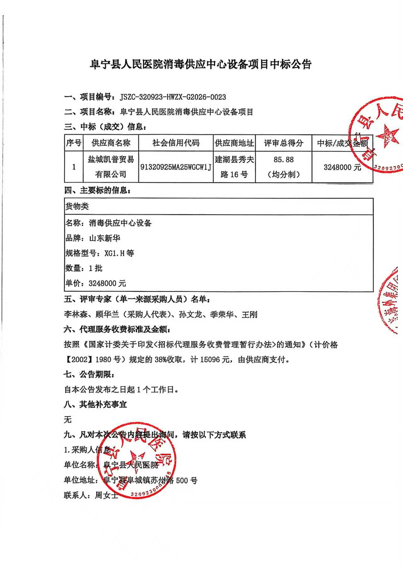 阜宁县人民医院消毒供应中心设备项目中标公告