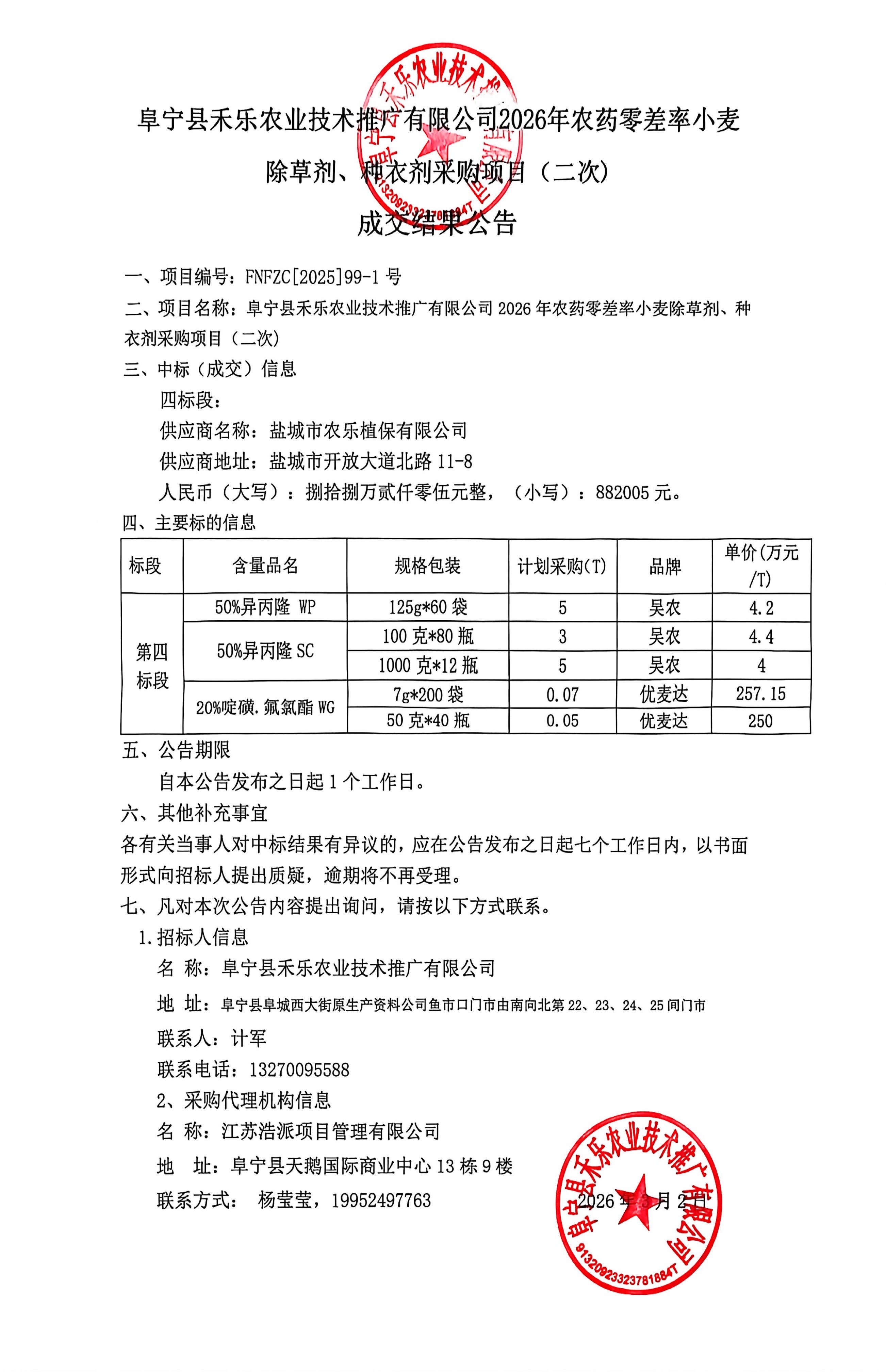 阜宁县禾乐农业技术推广有限公司2026年农药零差率小麦除草剂、种衣剂采购项目(二次)中标结果公告