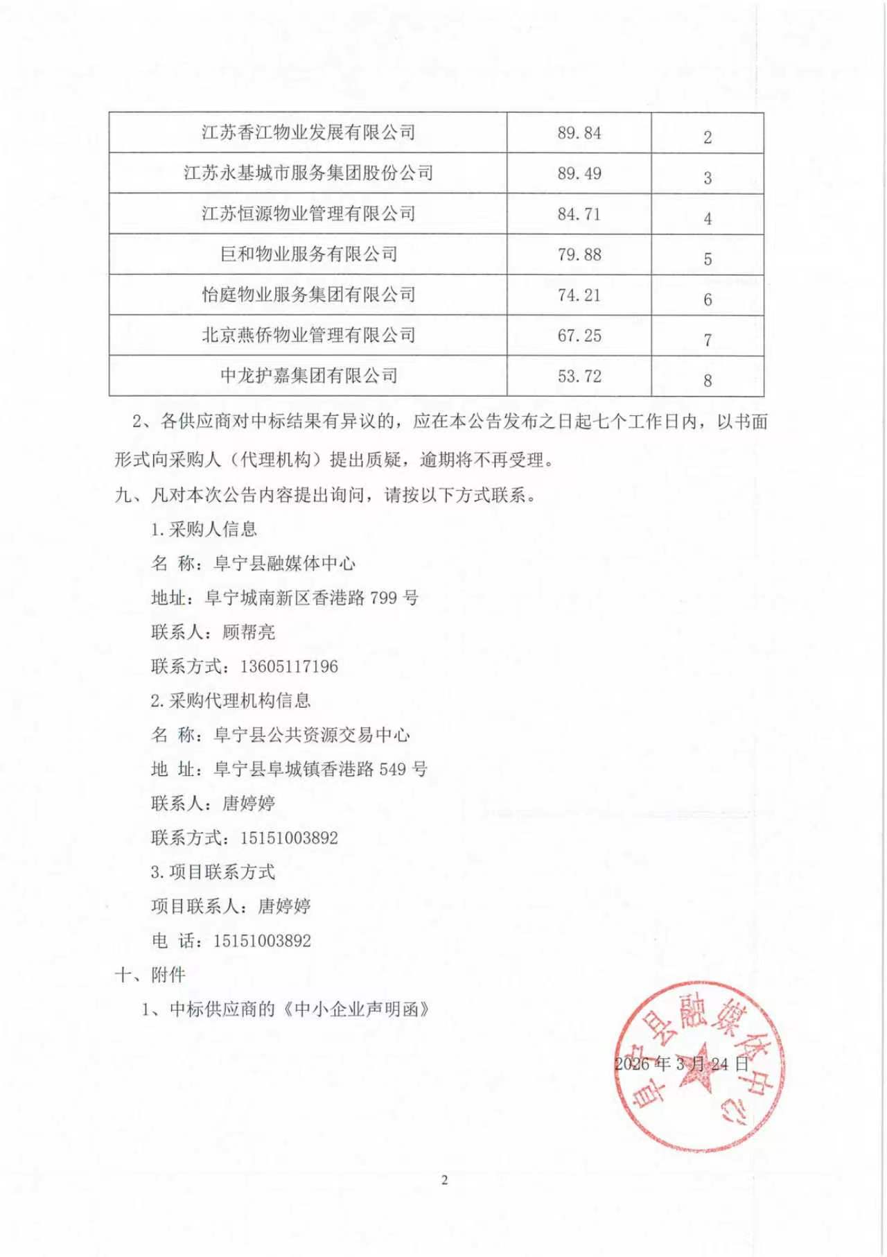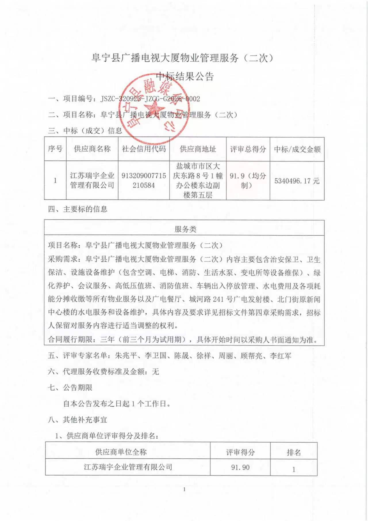 阜宁县广播电视大厦物业管理服务(二次)中标结果公告