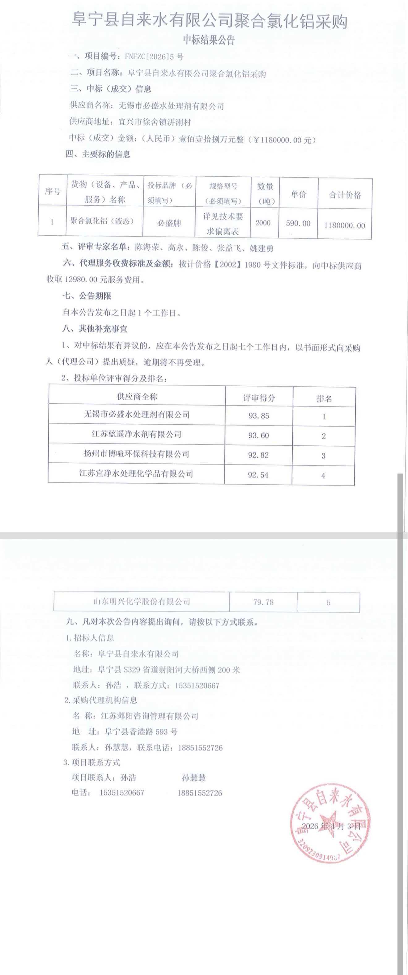 阜宁县自来水公司聚合氯化铝采购 中标结果公告