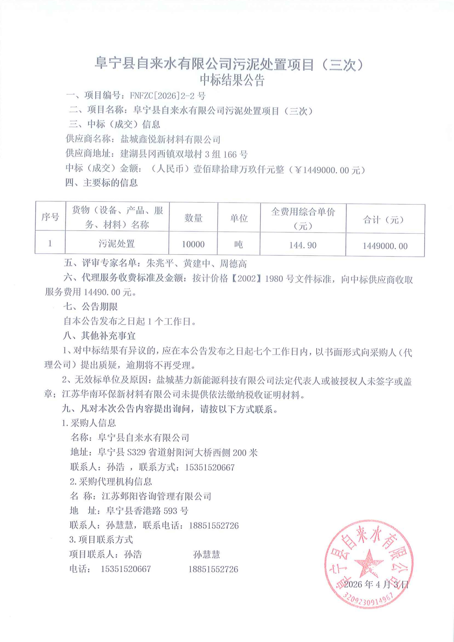 阜宁县自来水有限公司污泥处置项目(三次)中标结果公告
