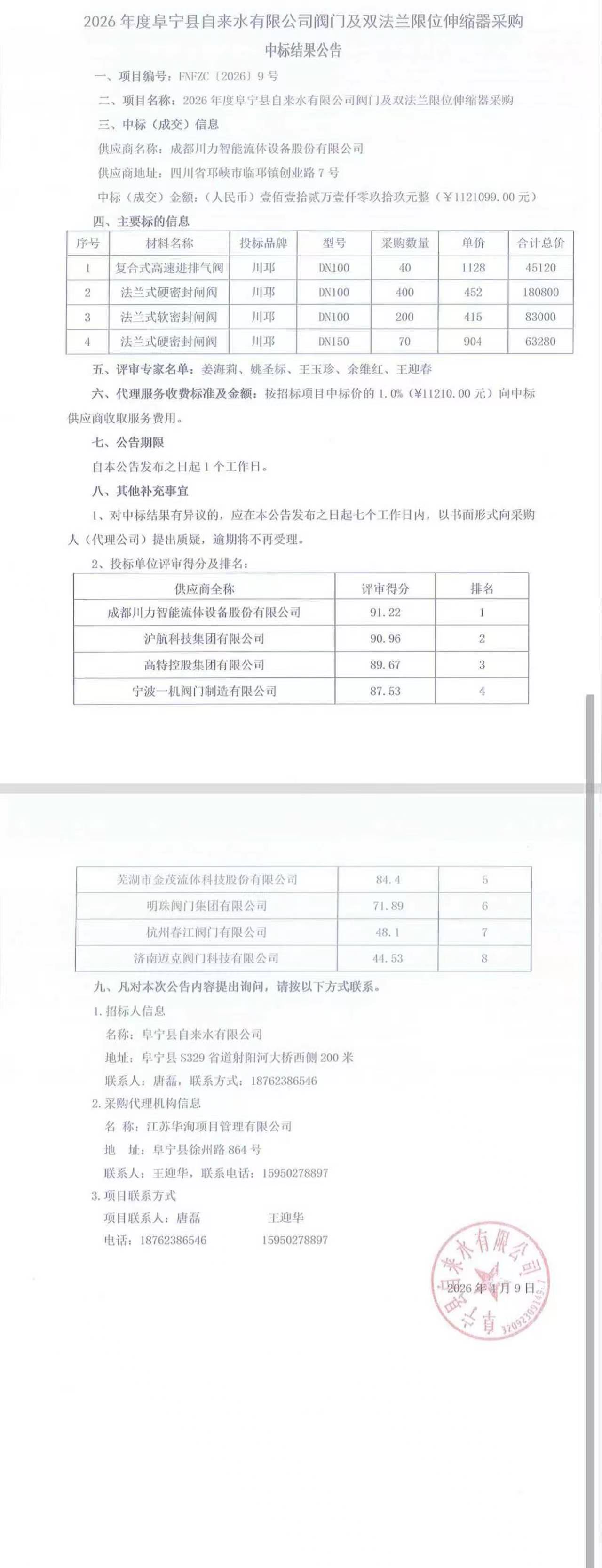 2026年度阜宁县自来水有限公司阀门及双法兰限位伸缩器采购中标结果公告