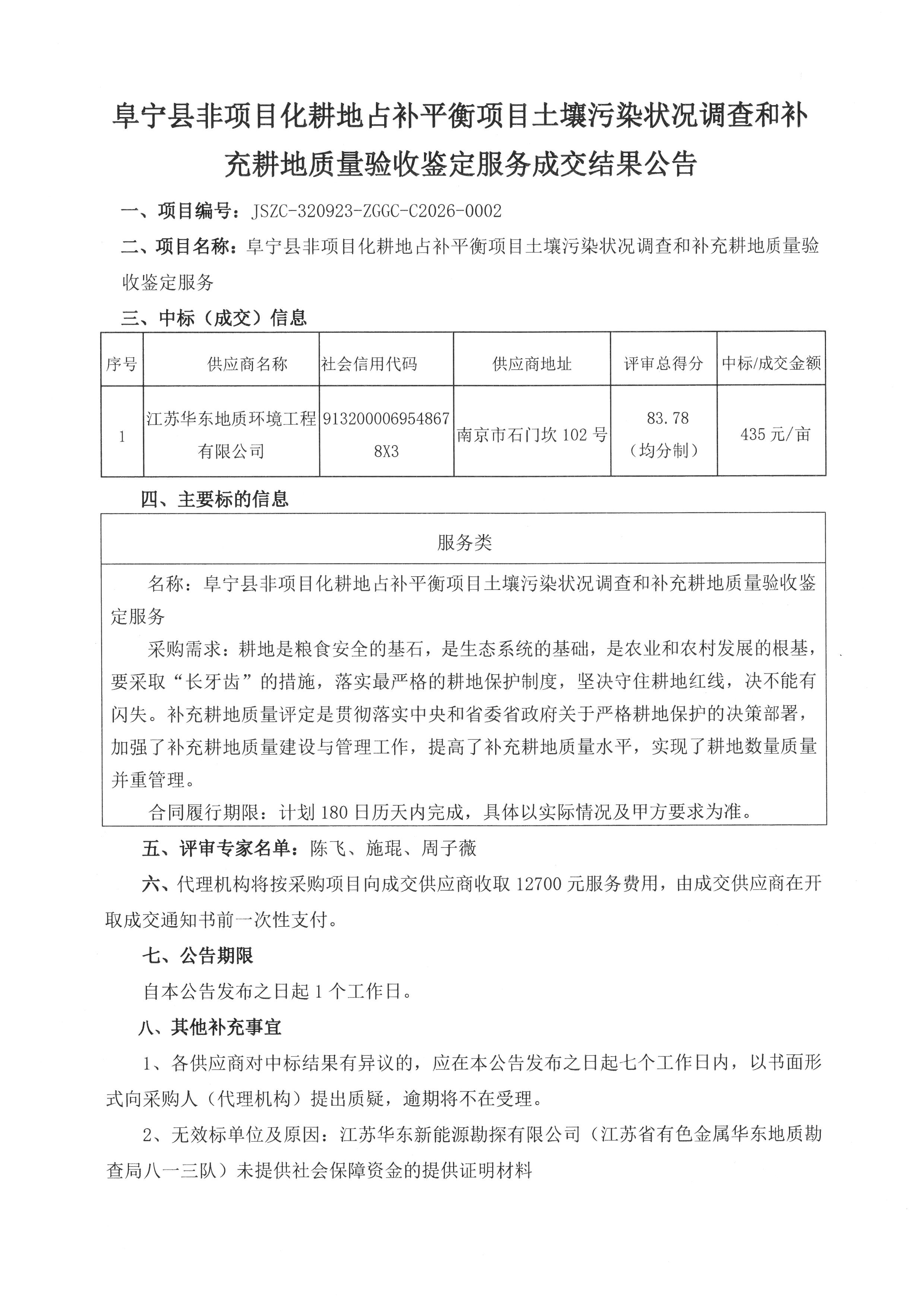 阜宁县非项目化耕地占补平衡项目土壤污染状况调查和补充耕地质量验收鉴定服务成交结果公告